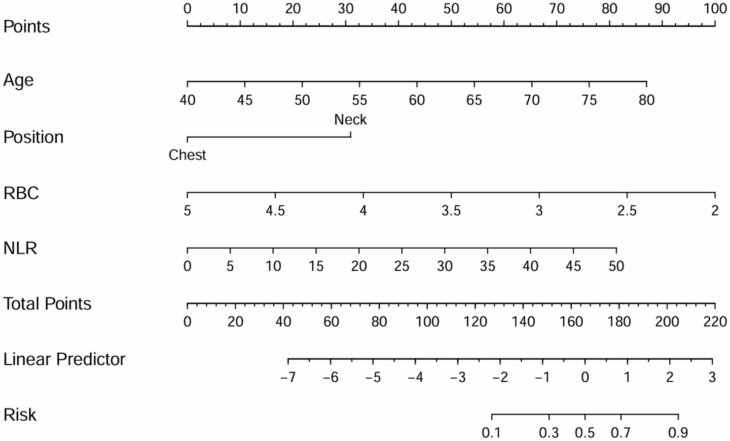 Conclusion: Age, anastomotic location, postoperative RBC count, and postoperative NLR were independent risk factors for AL after radical esophagectomy for ESCC. In addition, this study innovatively provides the mechanistic hypothesis linking cervical AL to the combined effects of anastomotic tension and impaired perfusion, offering a pathophysiological basis for its higher incidence than thoracic anastomosis.