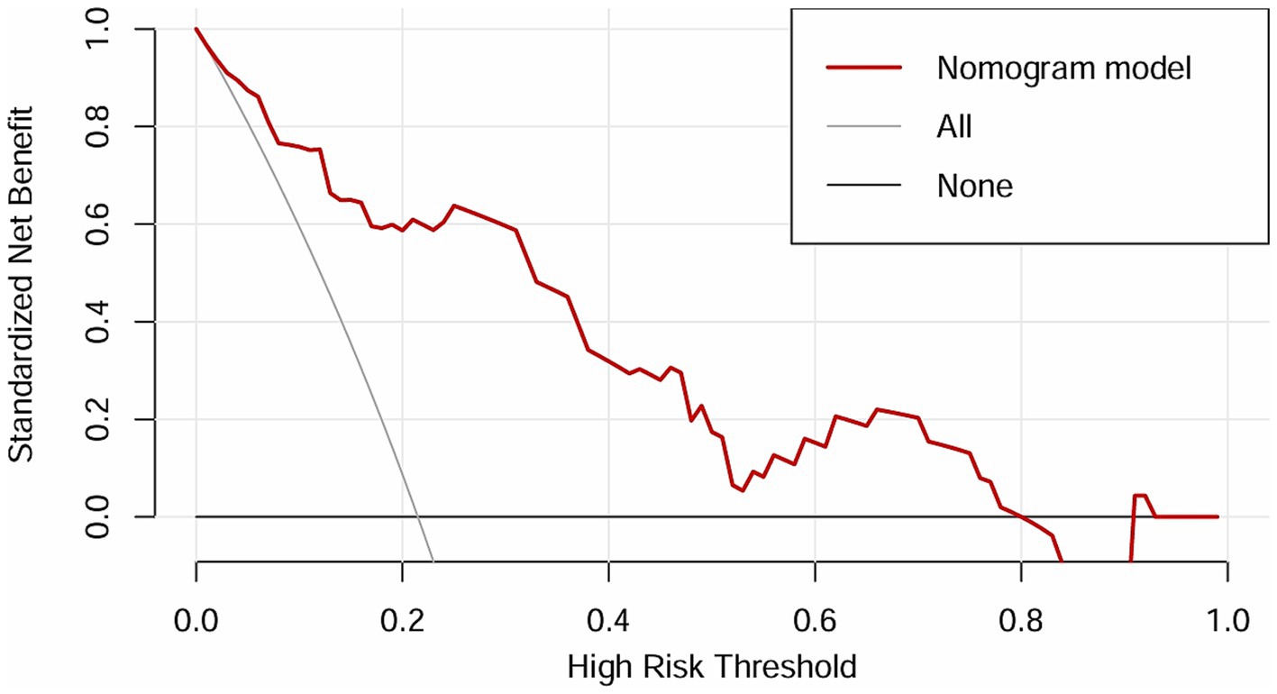 The independent risk factors identified from the multivariate logistic analysis were used to construct a predictive model for the risk of AL, which was presented as a nomogram (Figure 2). In this study, the calibration curve of the nomogram for predicting AL risk after esophagectomy for ESCC exhibited good consistency (Figure 3). The accuracy and reliability of the risk model were verified using the AUC of the ROC curve (AUC = 0.870) (Figure 4). DCA was used to assess the clinical utility of the nomogram model (Figure 5).