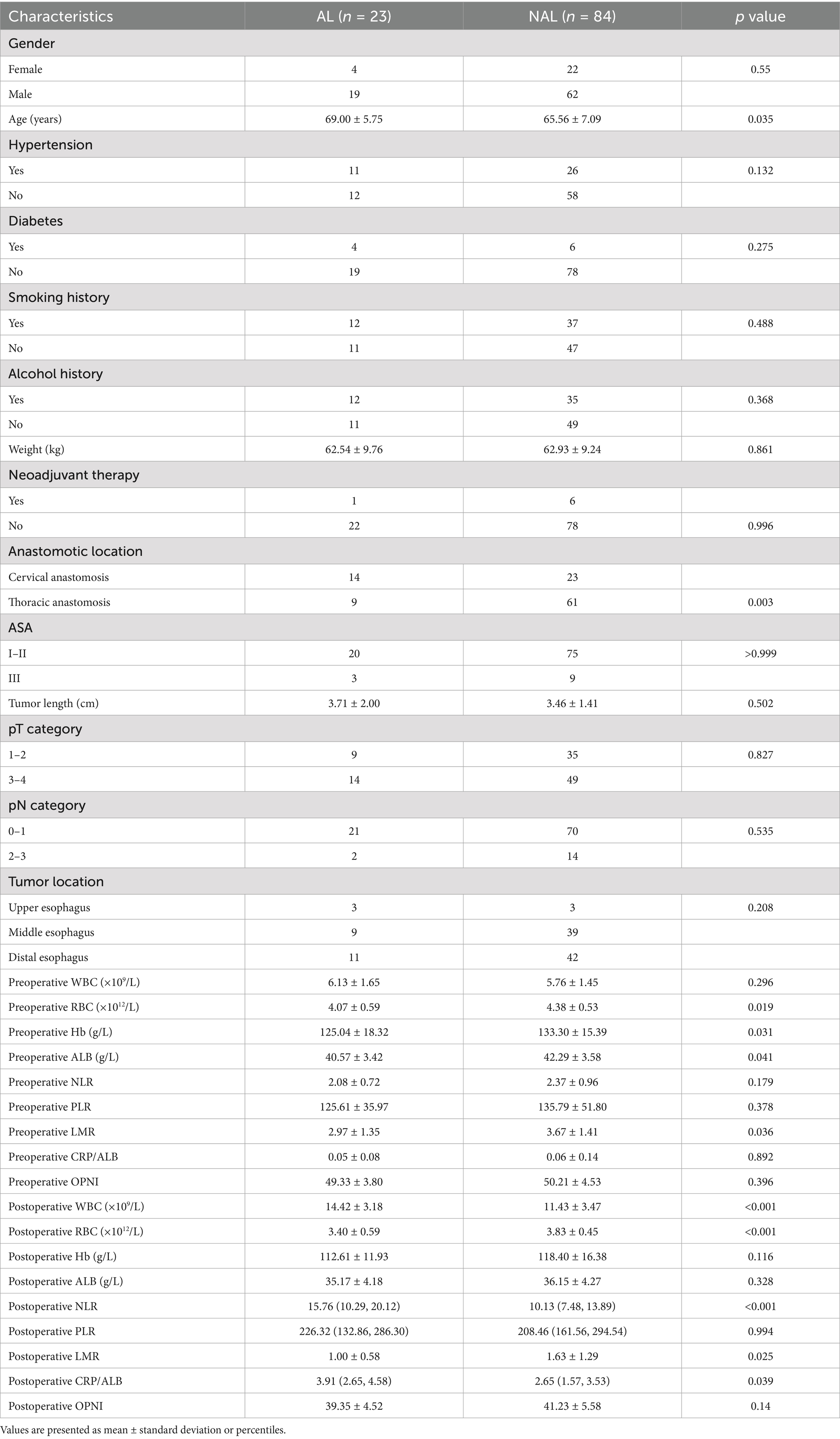A total of 107 patients were enrolled in this study, and the specific inclusion and exclusion flowchart is shown in Figure 1. All 107 patients had ESCC histologically. AL occurred in 23 patients with an incidence rate of 21.5%. The distribution of surgical procedures was as follows: Sweet procedure (3 cases), Ivor-Lewis esophagectomy (67 cases), and McKeown procedure (37 cases). Patient general characteristics, tumor-related data, perioperative infections and nutrition metrics are presented in Table 1.