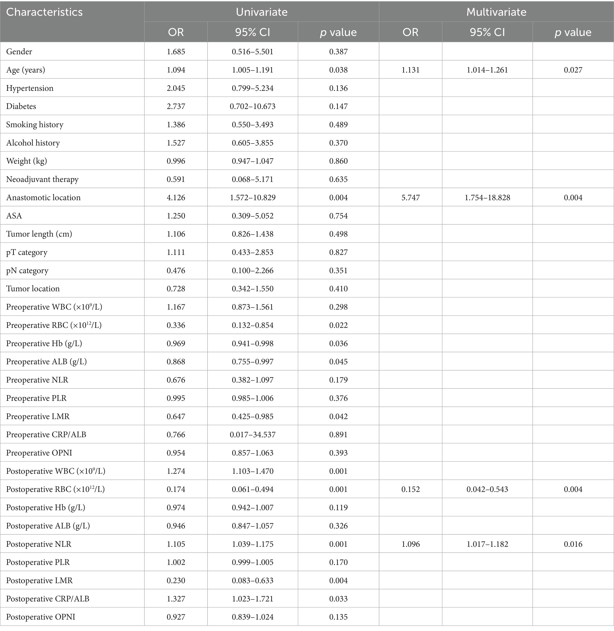Univariate logistic regression analysis (Table 2) showed 11 potential risk factors associated with the occurrence of AL: age, anastomotic location, and some preoperative laboratory results, including RBC, Hb, ALB, LMR and some postoperative laboratory results, including WBC count, RBC count, NLR, LMR, and CRP/ALB. These risk factors were incorporated into a multivariate logistic regression model (Table 2), age (OR 1.131, 95% CI 1.014–1.261, p = 0.027), anastomotic location (OR 5.747, 95% CI 1.754–18.828, p = 0.004), postoperative RBC count (OR 0.152, 95% CI 0.042–0.543, p = 0.004), and postoperative NLR (OR 1.096, 95% CI 1.017–1.182, p = 0.016) were determined to be independent risk factors for the occurrence of AL.