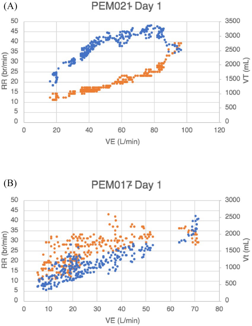 Figure 1. (A) Normal and (B) dysfunctional respiratory patterns in two different ME/CFS cases, with respiratory rate (RR) on the left y-axis and tidal volume (VT) on the right y-axis plotted against minute ventilation (VE) on the x-axis. (RR = respiratory rate, orange dots; VT tidal volume, blue dots) (see text).