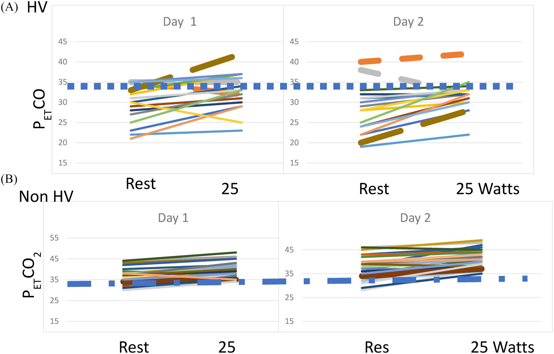 Figure 2. (A) PETCO2 at rest and 25 W on Day 1 and Day 2 of CPET in the patients with ME/CFS and persistent hyperventilation. The dashed line indicates a PETCO2 of 34 mm Hg. (B) PETCO2 at rest and 25 W on Day 1 and Day 2 of CPET in the patients with ME/CFS and no hyperventilation. The dashed line indicates a PETCO2 of 34 mm Hg.