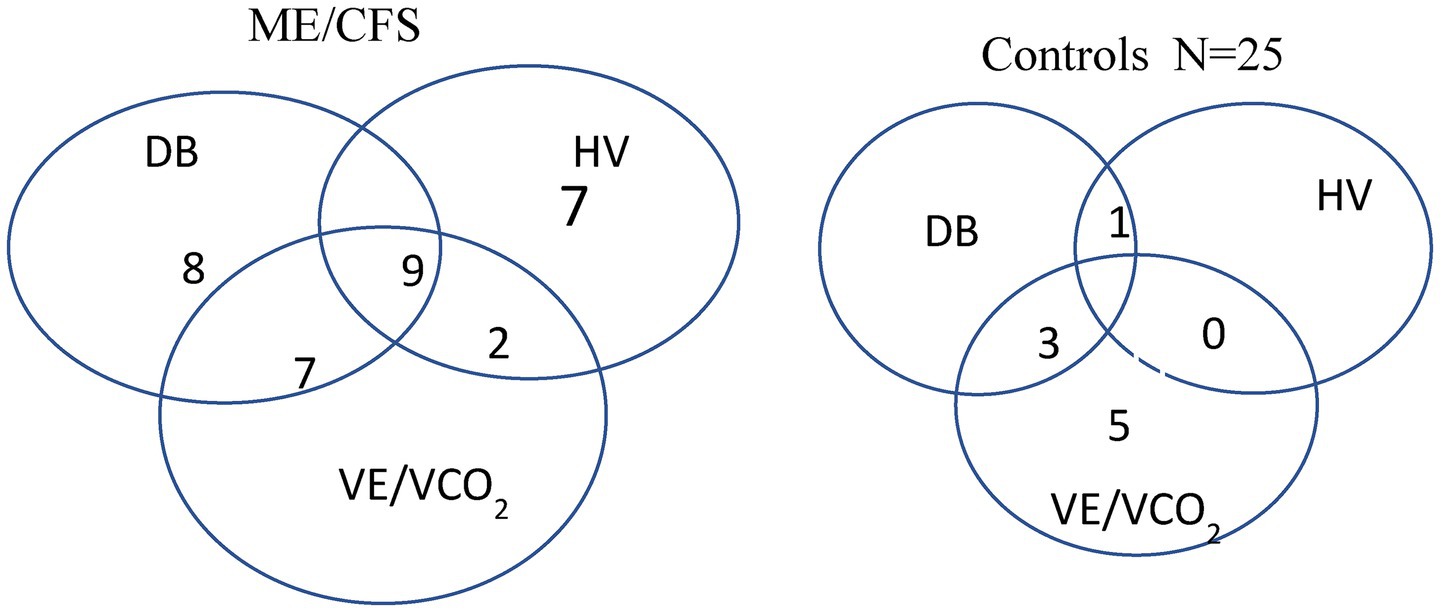 Figure 3. Venn diagrams showing the overlap of dysfunctional breathing, persistent hyperventilation, and elevated VE/VCO2 slope in the patients with ME/CFS and sedentary controls.