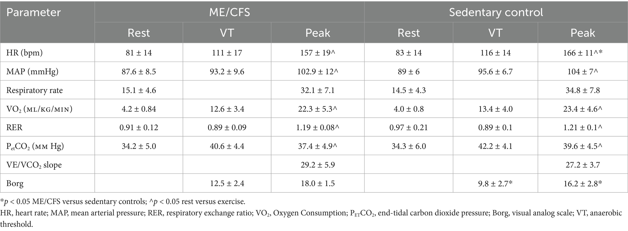 The study included 57 patients with ME/CFS (F:M = 46:11) with an average age of 38.6 ± 9.6 years and a mean BMI of 24.1 ± 3.4 and 25 sedentary controls (F:M = 20:5) with an average age of 38.2 ± 9.9 years and a mean BMI of 24.2 ± 3.4. There was no significant difference in the Godin Leisure-Time Exercise Questionnaire between the two groups (ME/CFS: 27.7 ± 35.5; Controls: 13.5 ± 14.4; p = 0.22), indicating that the healthy controls were as sedentary as the patients. All patients with ME/CFS and sedentary controls achieved an RER > 1.05, with a mean Borg scale rating of 18 at peak exercise (Table 1). In the patients with ME/CFS, peak VO2 averaged 22.4 ± 5.4 mL/kg/min, which was 79 ± 20% of predicted. The results from the 25 sedentary controls were comparable, although maximal HR was higher in the control group (p < 0.05) and perceived exertion at end exercise was significantly lower (p < 0.001).