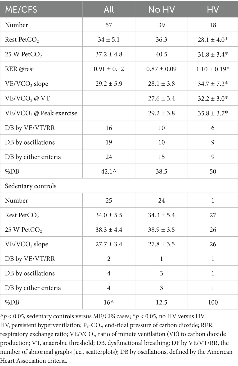Results: The patients with ME/CFS had an average age of 38.6 ± 9.6 years, and a mean body mass index (BMI) of 24.1 ± 3.4, which was comparable to the sedentary controls. All participants performed maximal exercise, achieving a respiratory exchange ratio (RER) of >1.05. For the patients with ME/CFS, peak VO2 averaged 22.3 ± 5.3 mL/kg/min, which was 79 ± 20% of predicted and comparable to that observed in the sedentary controls (23.4 ± 4.6 mL/kg/min; 81 ± 12%; p = NS). A total of 24 patients with ME/CFS (42.1%) met the criteria for dysfunctional breathing compared to four sedentary controls (16%) (p < 0.02). In total, 18 patients with ME/CFS (32%) had hyperventilation compared to one sedentary control participant (4%) (p < 0.01), and nine patients with ME/CFS had both hyperventilation and dysfunctional breathing, whereas no sedentary participant exhibited both. The patients with ME/CFS and hyperventilation had significantly higher VE/VCO2 ratios (HV+: 34.7 ± 7.2; HV−: 28.1 ± 3.8; p < 0.001). A total of 15 of 18 patients with hyperventilation (83%) had either elevated VE /VCO2 ratios (n = 15) or dysfunctional breathing (n = 9) compared to 44% (n = 17) of the 40 non-hyperventilators (p < 0.01).
