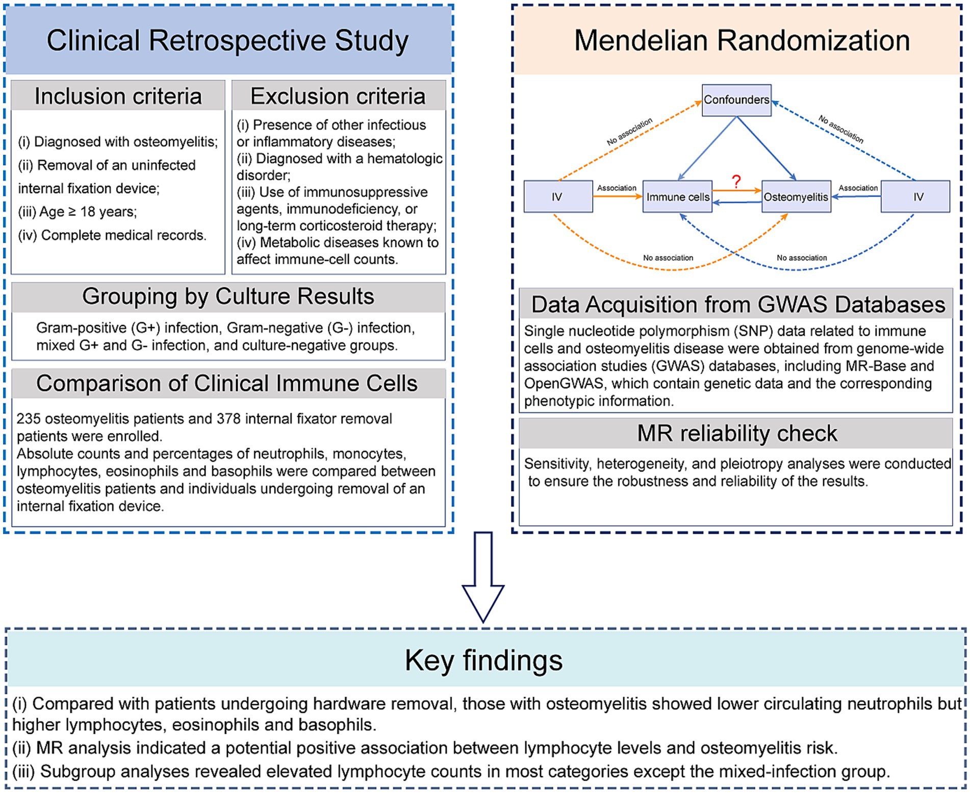 Methods: We retrospectively analyzed blood test data from patients admitted between July 1, 2023, and December 31, 2024, including those undergoing internal fixator removal and those with osteomyelitis. Based on the bacterial culture results, patients with osteomyelitis were categorized into four subgroups: Gram-positive, Gram-negative, mixed infections, and culture-negative. The impact of bacterial infections on immune cells was assessed, and two-sample Mendelian randomization was applied to evaluate the bidirectional causality between immune cells and osteomyelitis. Causal effects were primarily estimated using inverse-variance weighted and weighted-median methods, with F-statistic calculations and sensitivity analyses conducted to bolster the credibility of the results.