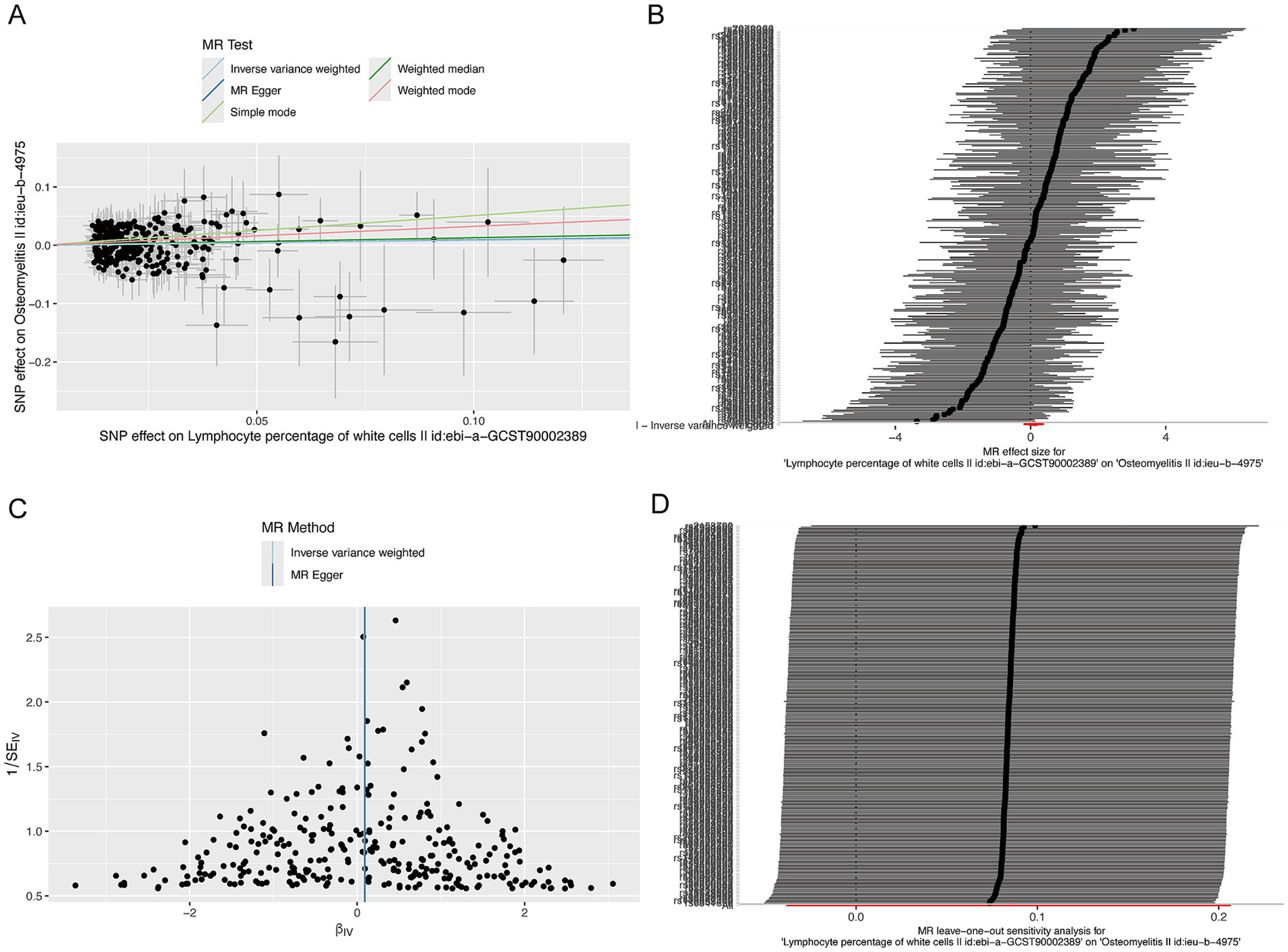 Scatter plots visually confirmed the positive association between circulating lymphocytes and osteomyelitis (Figure 3A). Forest plots of the combined effect estimates and CIs further supported this positive relationship (Figure 3B). No significant pleiotropy was detected by the MR-Egger intercept method. Heterogeneity analyses (the IVW and MR-Egger methods) revealed no substantial heterogeneity. Funnel plot symmetry indicated the absence of directional pleiotropy or significant bias in effect estimates (Figure 3C). Leave-one-out sensitivity analysis demonstrated the stability and robustness of the causal effect, as no single IV significantly altered the overall estimate upon removal (Figure 3D).