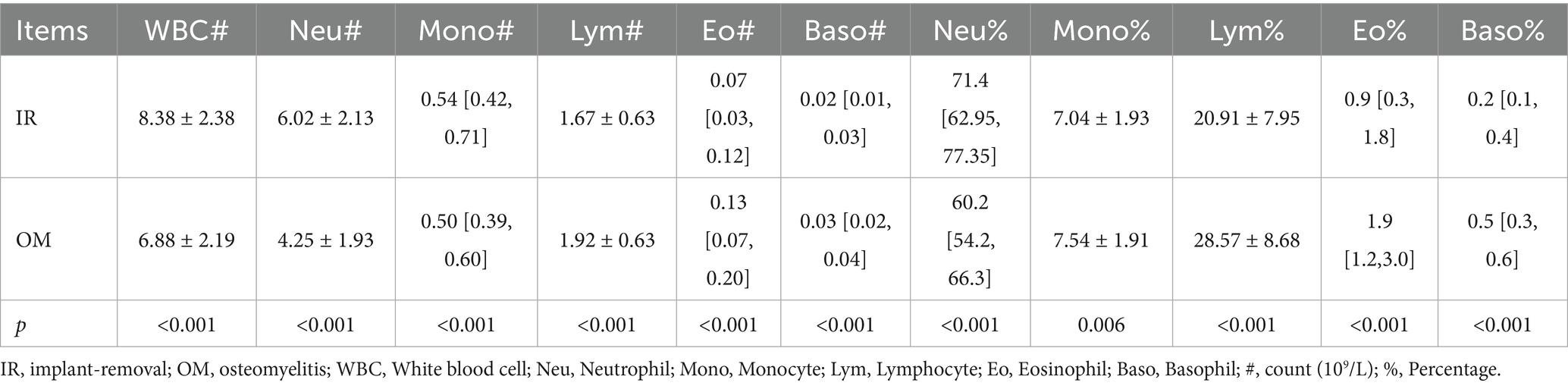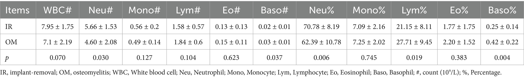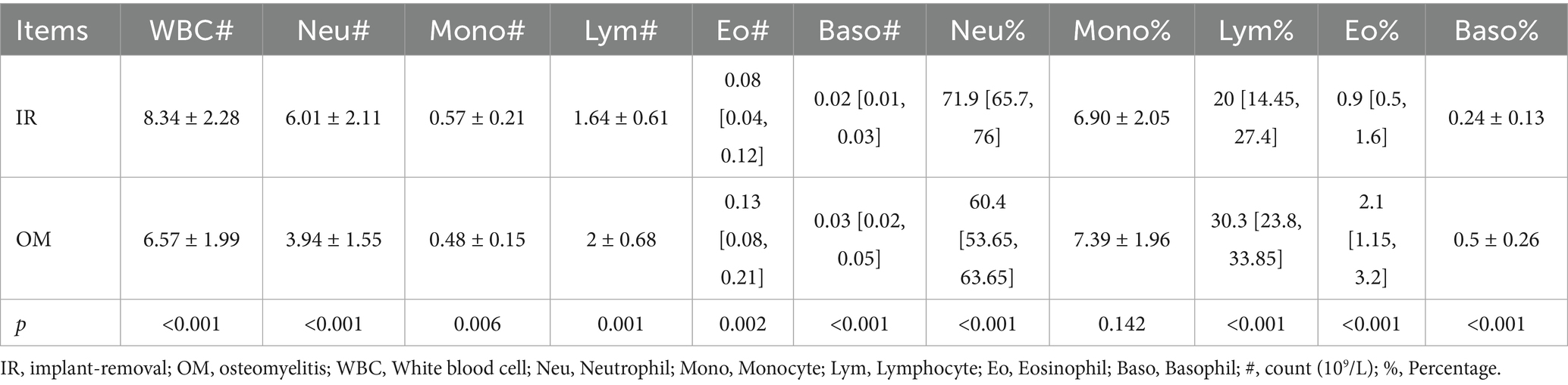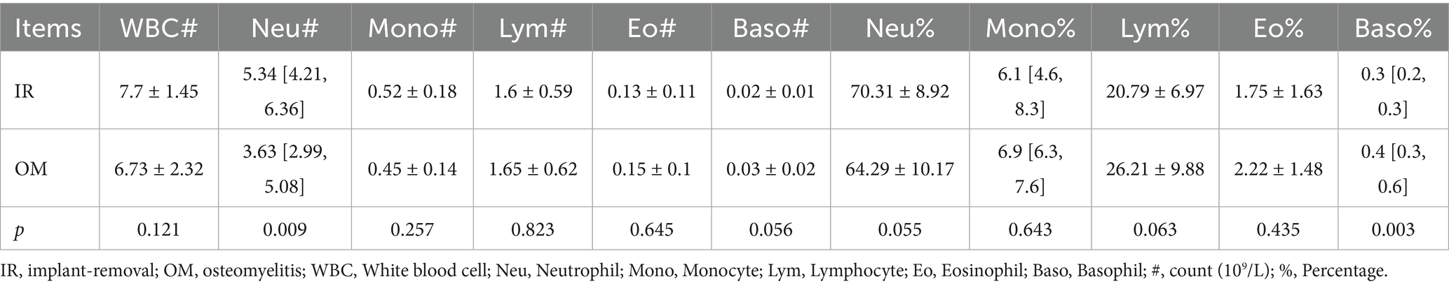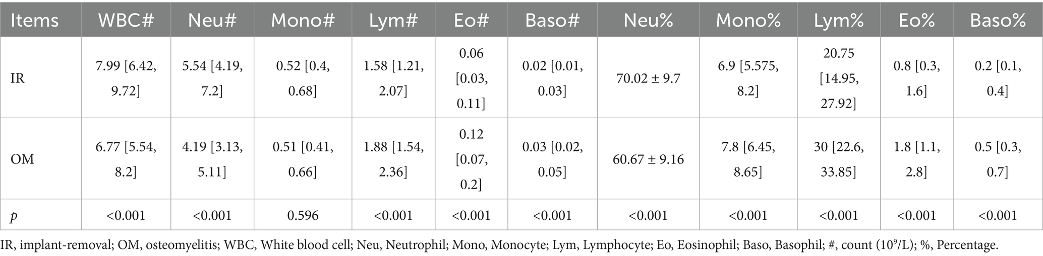 Significant differences in immune cell profiles were observed between the osteomyelitis and internal fixator removal groups. Compared with the internal fixator removal group, patients with osteomyelitis exhibited significantly lower counts of white blood cells, neutrophils, monocytes and reduced percentages of neutrophils. In contrast, the counts and percentages of lymphocytes, eosinophils, and basophils were significantly higher in patients with osteomyelitis. Additionally, the percentage of monocytes was significantly higher in the osteomyelitis group (Table 1).