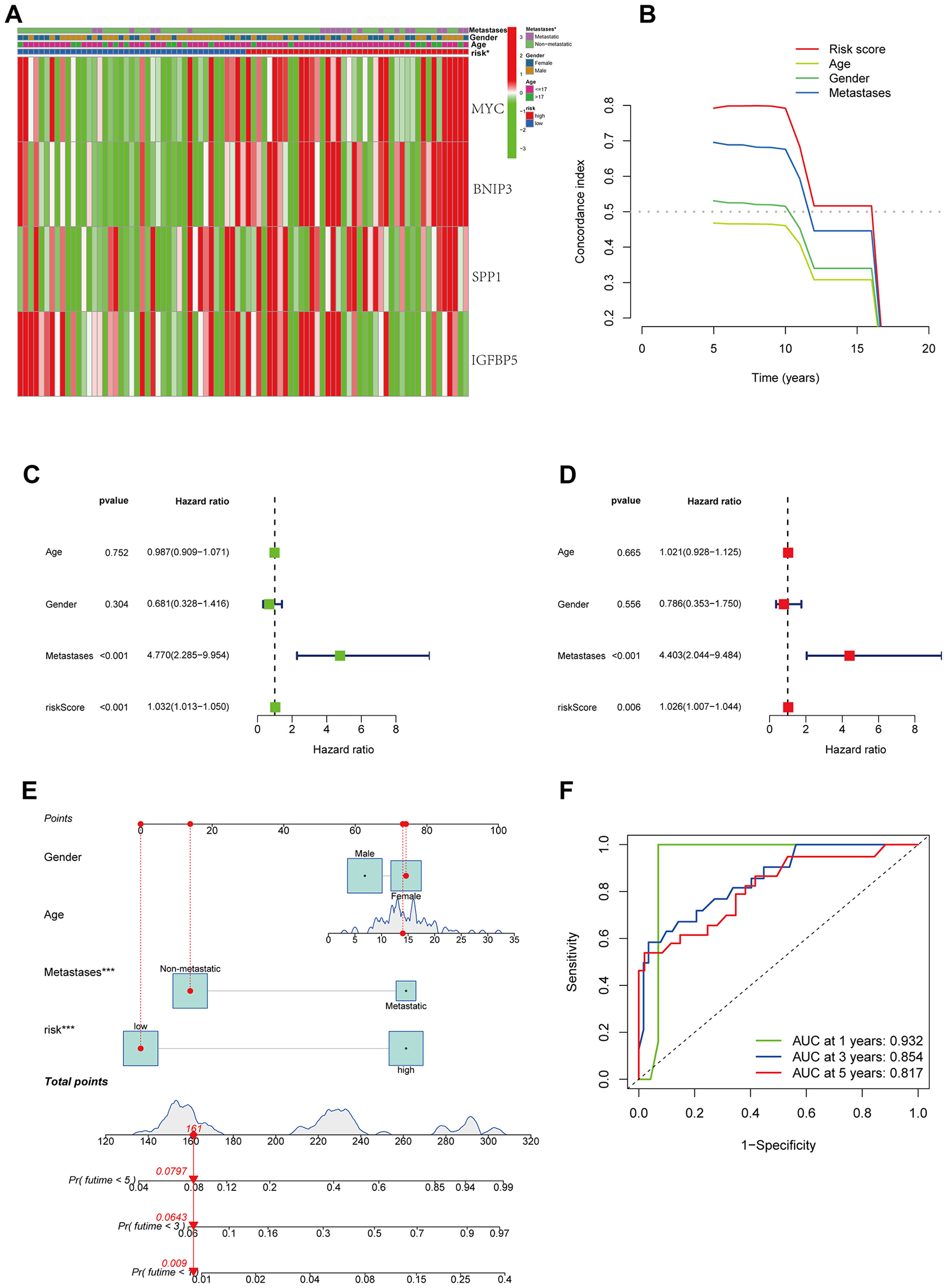 Combination of prognostic models and clinical features. (A) The relationship between the modeling genes and clinical characteristics of patients. (B) C-index of prognostic models and clinical features. (C, D) univariate and multivariate analysis. (E) Nomogram of prognostic models and clinical features. (F) ROC curve of nomogram.