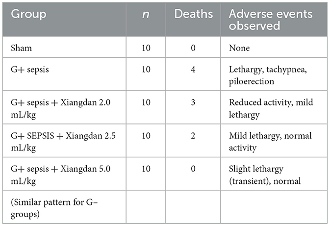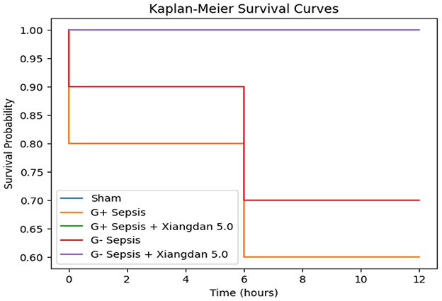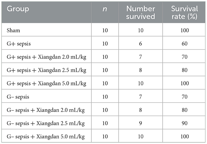 Mice were monitored for survival for 12 h after bacterial challenge, consistent with our prespecified humane endpoint. At 12 h post-modeling, survival rates were 60% in the G+ sepsis group and 70% in the G– sepsis group. Xiangdan injection improved 12-h survival in a dose-dependent manner: