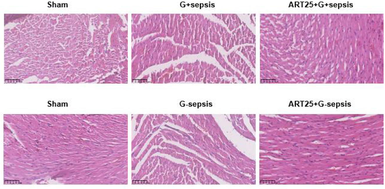 Hematoxylin and eosin (HE) staining of myocardial tissue showed intact and orderly myocardial fibers in the Sham group. In contrast, myocardial tissue in G+ and G– sepsis groups exhibited disorganized fibers, interstitial edema, blurred striations, and marked inflammatory cell infiltration. Treatment with Xiangdan injection significantly ameliorated these structural abnormalities in a dose-dependent manner. Quantitative histological scores were significantly lower in all Xiangdan-treated groups compared to their respective sepsis controls (P < 0.05), with no significant differences between G+ and G– subgroups (Table 4; Figures 2, 3).