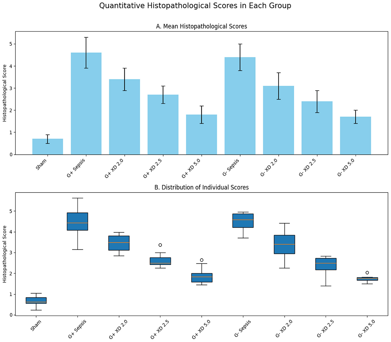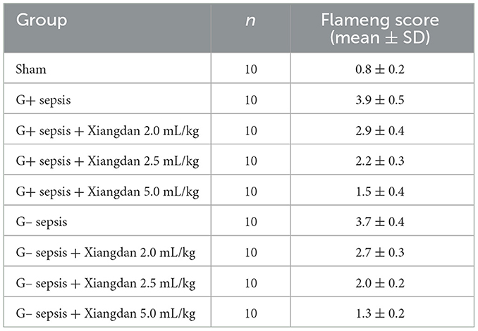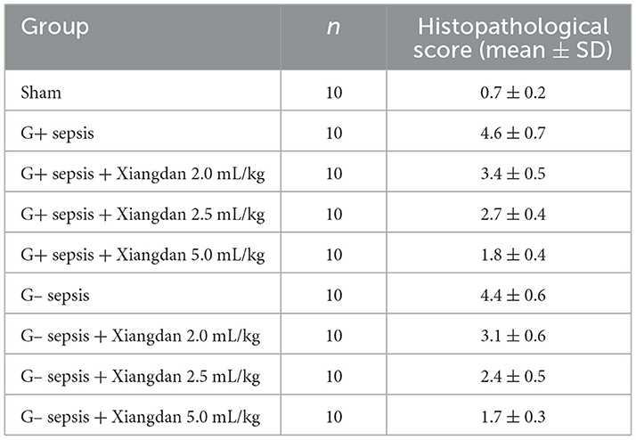 Figure 3. Quantitative histopathological scores in each group after oral administration of Xiangdan injection. (A) Mean histopathological scores (mean ± SD; n = 10 animals per group). (B) Distribution of individual histopathological scores. Statistical differences were analyzed by two-way ANOVA with Tukey's post hoc test. p < 0.05, p < 0.01, p < 0.001 vs. sepsis control.