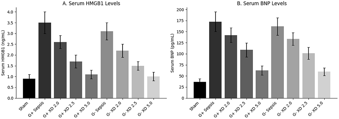 Figure 5. Serum HMGB1 and BNP Levels in Each Group. (A, B) Display group means (± SD) for serum HMGB1 and BNP, respectively. Xiangdan injection reduced sepsis-induced elevations in both biomarkers in a dose-dependent fashion.