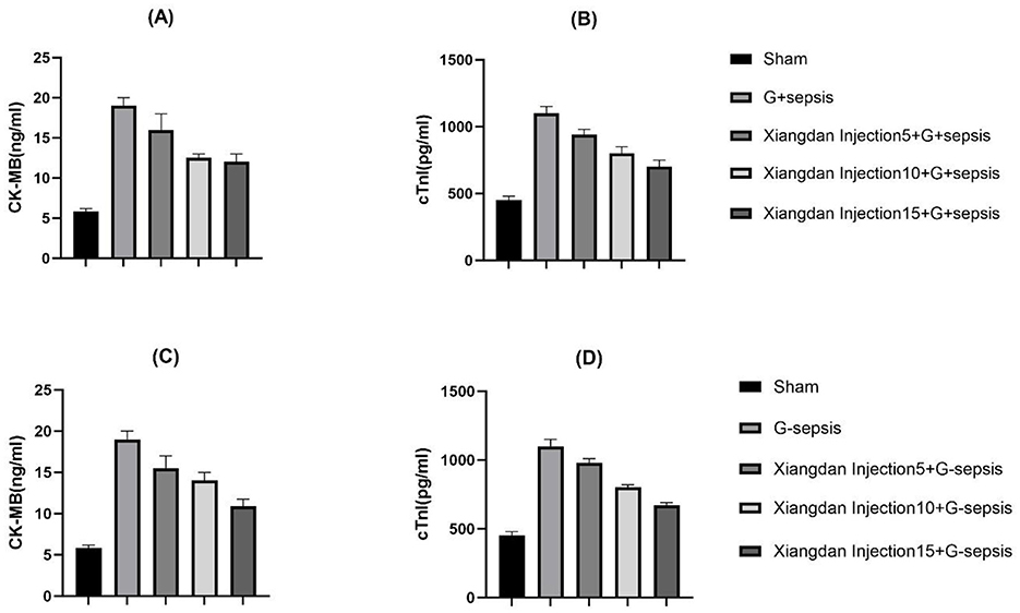 Figure 6. Markers of myocardial injury in mice caused by G+/G– bacteria different concentrations of Xiangdan injection intervention. Bar charts with error bars (A) Serum CK - MB levels in each group of G+ mice, n = 5; (B) Serum cTnI levels in each group of G+ mice, n = 5; (C) Serum CK - MB levels in each group of G– mice, n = 5; (D) Serum cTnI levels in each group of G– mice, n = 5; G+ sepsis is the Staphylococcus aureus sepsis group; G - sepsis is the Escherichia coli sepsis group.