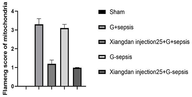 Figure 7. Mitochondrial injury score in septic mice caused by Xiangdan injection intervention with different strains. Myocardial mitochondrial changes and scores in rats of each group, n = 5. The G+ sepsis group is the Staphylococcus aureus sepsis group, and the G– sepsis group is the Escherichia coli sepsis group.