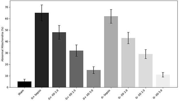 Figure 8. Quantitative analysis of mitochondrial abnormalities. Bar chart displays the percentage of abnormal mitochondria in myocardial tissue across all experimental groups. Xiangdan injection resulted in a dose-dependent reduction in mitochondrial abnormalities compared to untreated sepsis groups.