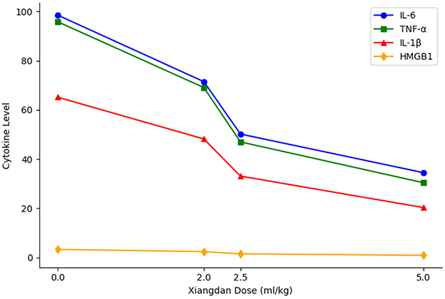 Figure 9. Dose-dependent reduction of inflammatory cytokines. Line graph demonstrates that increasing doses of Xiangdan injection resulted in progressive, dose-dependent reductions in IL-6, TNF-α, IL-1β, and HMGB1 levels in septic mice.