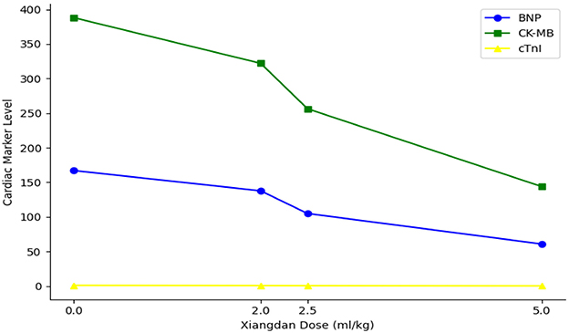 Figure 10. Dose-dependent reduction in cardiac injury markers. Line plot shows progressive, dose-dependent decreases in BNP, CK-MB, and cTnI levels with increasing doses of Xiangdan injection in septic mice.