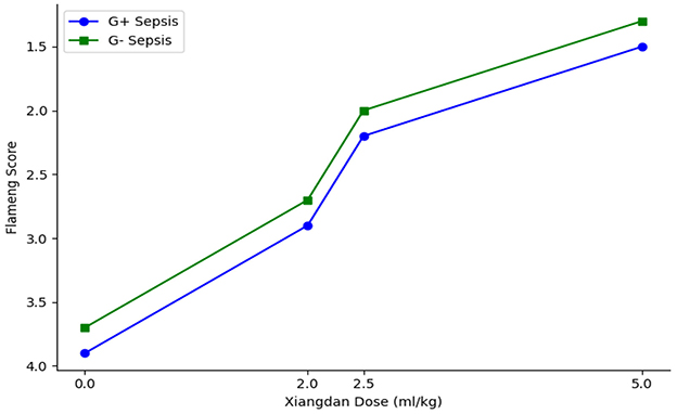 Figure 11. Dose-dependent preservation of mitochondrial integrity. Line plot demonstrates that increasing doses of Xiangdan injection lead to progressive, dose-dependent preservation of myocardial mitochondrial integrity (lower Flameng scores) in both G+ and G– sepsis models.
