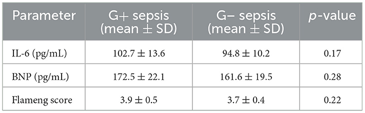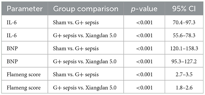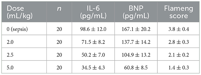 A clear dose-dependent effect of Xiangdan injection was observed across all key outcomes, including reductions in IL-6, BNP, and Flameng mitochondrial scores. These effects were consistent across both G+ and G– sepsis models, and summarized in Table 8 and Figures 9–11. Comparative analysis between G+ and G– sepsis groups revealed no statistically significant differences in most outcome measures (P > 0.05), suggesting consistent efficacy of Xiangdan injection regardless of bacterial strain (Table 9). A comprehensive summary of all outcomes by group is provided in Table 10.