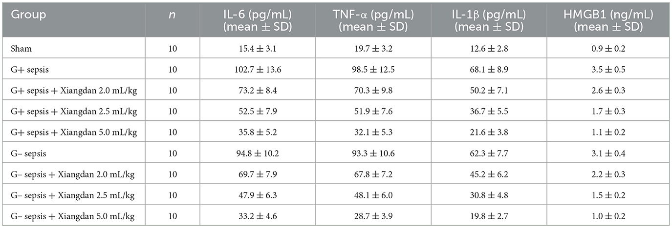 Serum levels of IL-6, TNF-α, IL-1β, and HMGB1 were markedly elevated in sepsis groups compared to Sham (P < 0.001). Xiangdan injection significantly reduced these inflammatory markers in a dose-dependent manner (P < 0.05), with cytokine levels in the 5.0 mL/kg group approaching those in the Sham group (Table 5; Figures 4, 5).