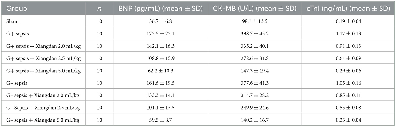Levels of cardiac biomarkers BNP, CK-MB, and cTnI were significantly increased in sepsis groups compared to Sham (P < 0.001), indicating myocardial damage. Xiangdan injection treatment significantly decreased levels of all three markers in a dose-dependent fashion (P < 0.05). At the highest dose (5.0 mL/kg), biomarker levels were substantially reduced and approached baseline (Table 6; Figure 6).