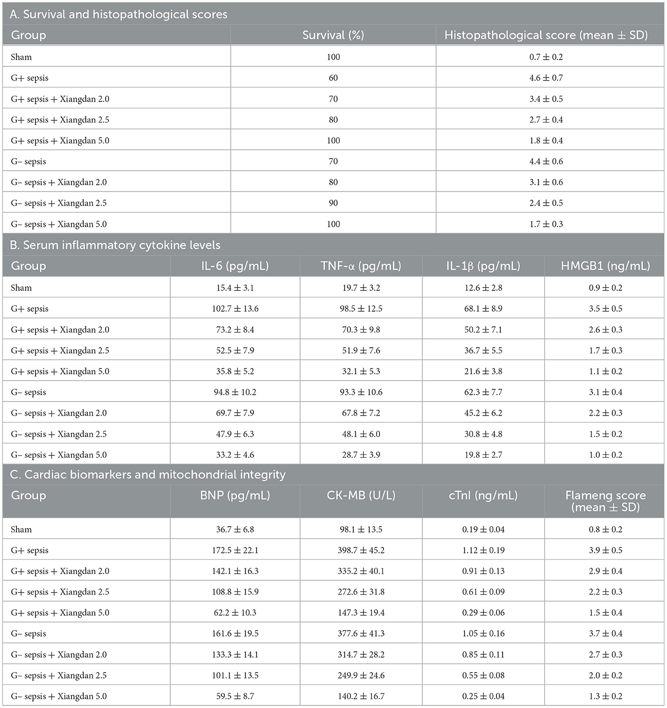 Methods: Male C57BL/6 mice were assigned to sham, sepsis, and three Xiangdan dose groups for each bacterial model using a randomization schedule. Xiangdan injection was administered by oral gavage 12 h before and immediately after bacterial challenge (prophylaxis/early intervention). Outcomes included survival, serum inflammatory cytokines, cardiac biomarkers, histopathology, and ultrastructural mitochondrial integrity.