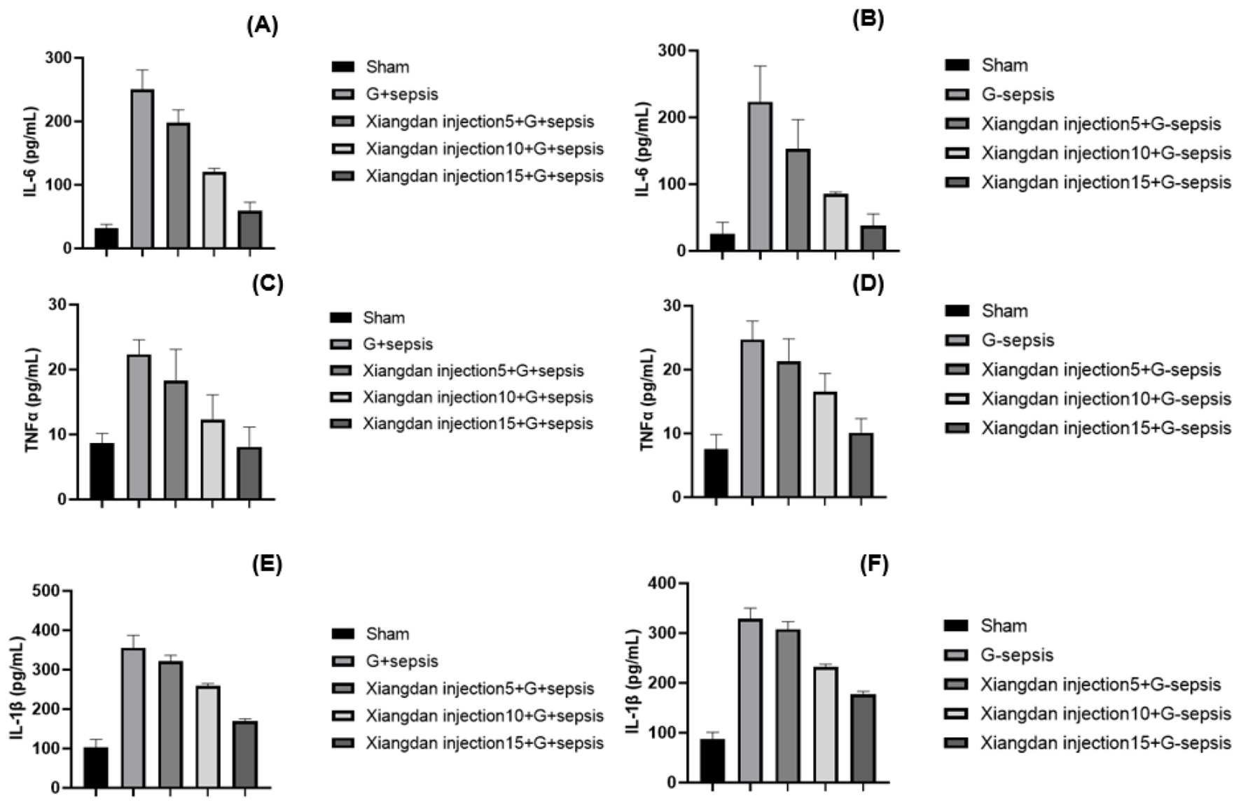 Figure 4. Markers of inflammatory cytokines in mice caused by G+/G– bacteria different concentrations of Xiangdan injection intervention. Bar chart with error bard (mean ± SD) (A) IL-6 levels in each group of G+ mice, n = 5; (B) IL-6 levels in each group of G– mice, n = 5; (C) TNF α levels in each group of G+ mice, n = 5; (D) TNF α levels in each group of G– mice, n = 5; (D) TNF α levels in each group of G– mice, n = 5; (D) TNF α levels in each group of G- mice, n = 5; (E) IL-1β levels in each group of G+ mice, n = 5; (F) IL-1β levels in each group of G– mice, n = 5. G+ sepsis is the Staphylococcus aureus sepsis group; G– sepsis is the Escherichia coli sepsis group.