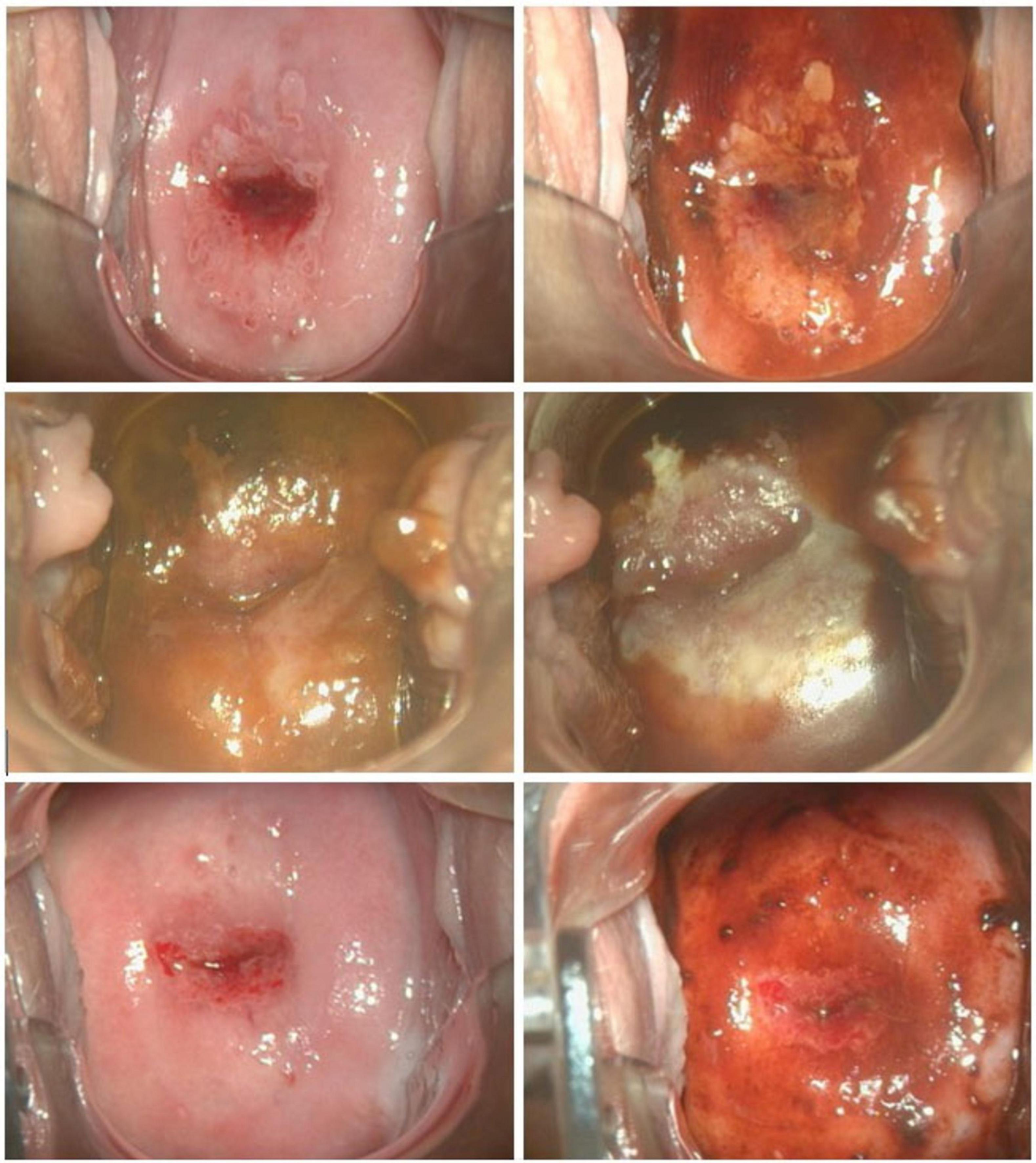 Figure 2. Representative colposcopic images at initial colposcopic examination (upper row) performing VIA (left) and iodine staining (right); at APD intervention (middle row) before (left) and after (right) APD treatment; at preoperative assessment 8 weeks after APD treatment (bottom row) performing VIA (left) and iodine staining (right).
