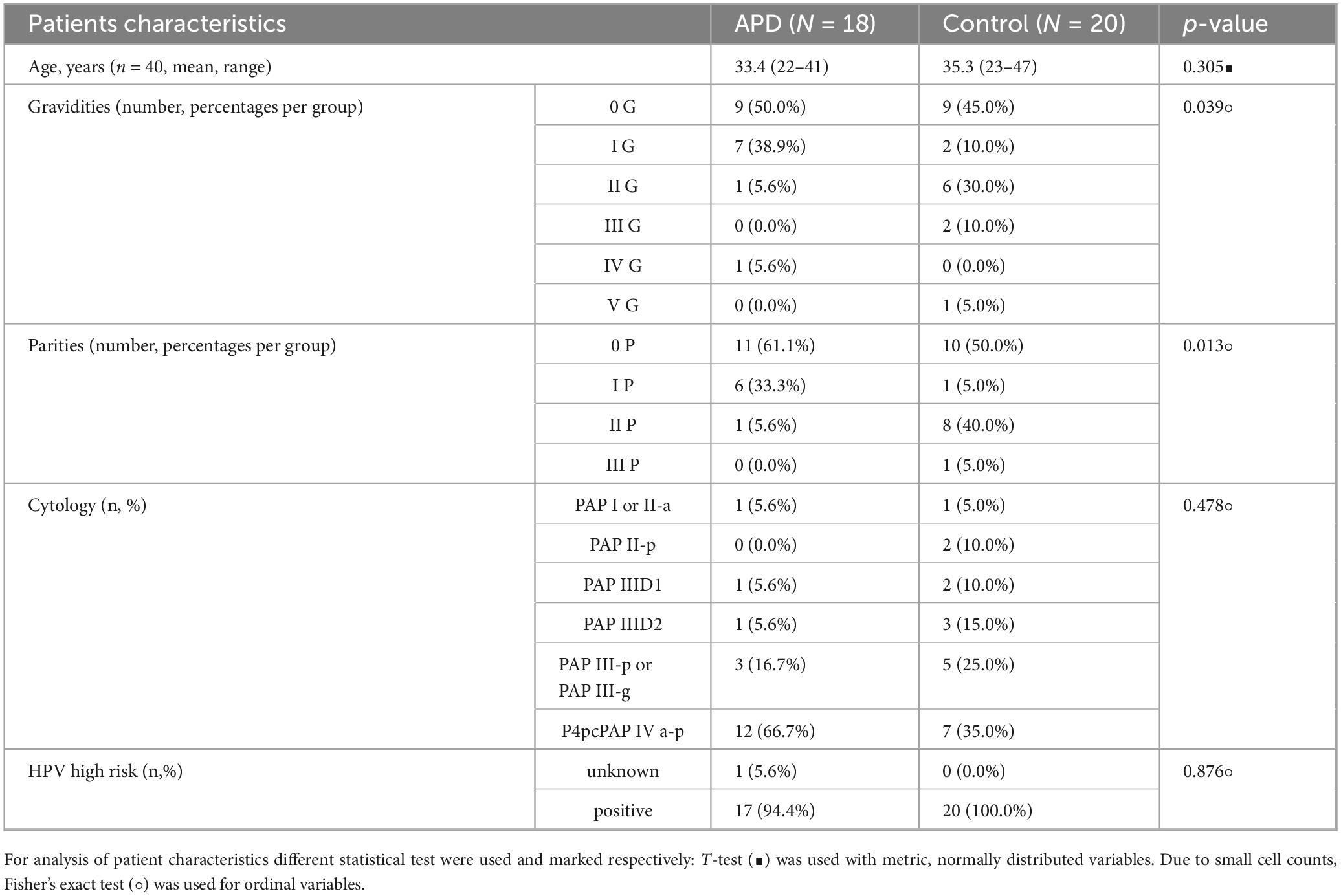 In this study, we included women over 18 years of age with histologically confirmed CIN3. Complete visibility of the entire transformation zone (T1/2), including the margins of high-grade intraepithelial lesions, was required for participation. Exclusion criteria included incomplete visualization of the transformation zone or endocervical disease, evidence of invasive disease, severe systemic diseases, pregnancy or a preference for immediate surgical resection. Patients were informed of the experimental nature of APD application, which had demonstrated promising effects in treating CIN 1/2 lesions (18). Written informed consent was obtained in accordance with the approved ethical protocol (929/2020B01) before initiating APD or control treatment. Table 1 presents the characteristics of APD-treated patients compared to the control group. At baseline, 5.6% of patients in the APD group and 5.0% in the control group had normal cytological results (PAP I or PAP II-a). In the APD group, 27.9% were classified within the PAP III (D1/D2/-p) group compared to 50.0% in the control group, while 66.7% of the APD group were diagnosed with PAP IVa-p compared to 35.0% in the control group. 94.4% of APD treated patients and 100.0% in the control group were hrHPV-positive at baseline. In one APD case (5.6%) HPV testing lacked technical evaluability. Generally, no clinically relevant differences of baseline parameters were observed between the two groups.