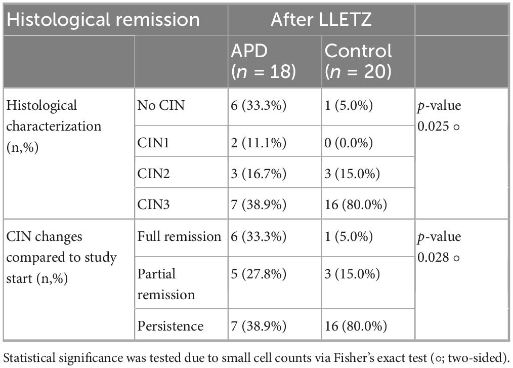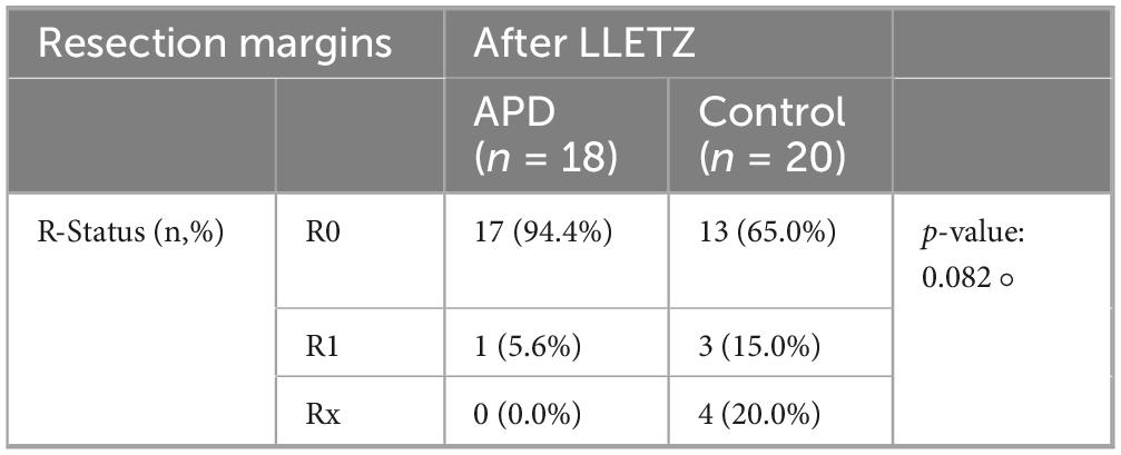 Table 3. Resection margins after LLETZ ± APD-treatment, statistical significance was determined via Fisher’s exact test (°; two-sided) due to small cell counts.