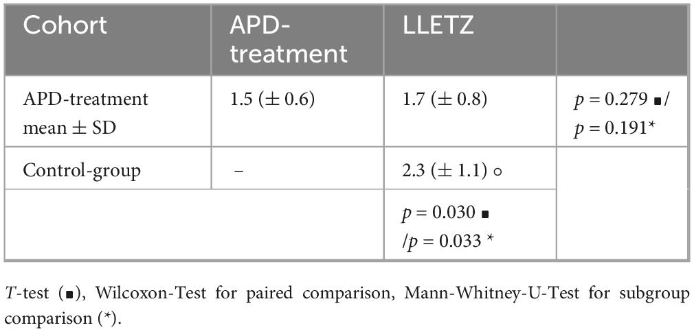 For the acquisition of possible perception of pain following APD treatment we used a visual analog scale from 0 to 10. Scores of 0 and 1 were defined as “no pain,” 2–4 as “mild pain,” 5–7 as “moderate pain” and 8–10 as “severe pain.” Other medical conditions could be indicated as free text. Assessment of treatment satisfaction after APD intervention the “Freiburg index of patient satisfaction” was applied (19).
