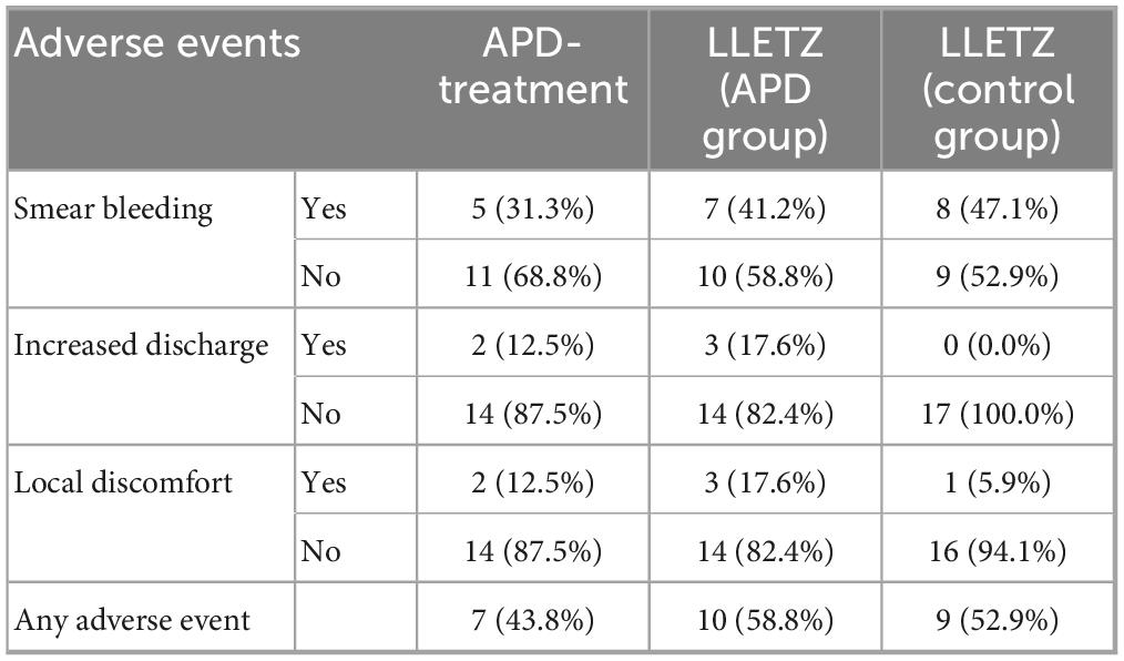 No acute dose-limiting toxicities were observed during APD treatment and LLETZ. Study participants reported only mild adverse events, including smear bleeding, localized discomfort, and increased vaginal discharge, following both APD treatment and LLETZ. There were no statistically significant differences in the frequency of adverse events between the two groups. All reported side effects resolved spontaneously without the need for additional surgical intervention. An overview of the reported adverse events is presented in Table 5, with multiple responses allowed.