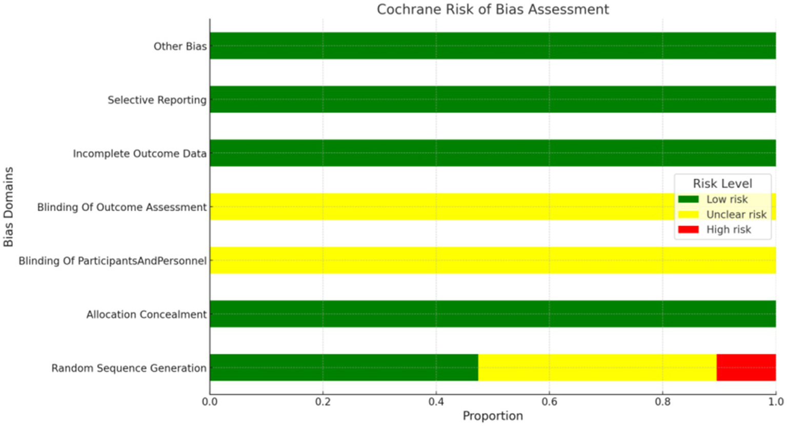 Two researchers independently assessed the risk of bias in the included studies following the Cochrane Handbook (20). The evaluation covered sequence generation, allocation concealment, blinding, completeness of outcome data, selective reporting, and other potential biases. Disagreements were resolved through discussion or consultation with a third researcher. In addition, the overall confidence in the network meta-analysis was appraised using the CINeMA (Confidence in Network Meta-Analysis) framework, which evaluates within-study bias, reporting bias, indirectness, imprecision, heterogeneity, and incoherence.