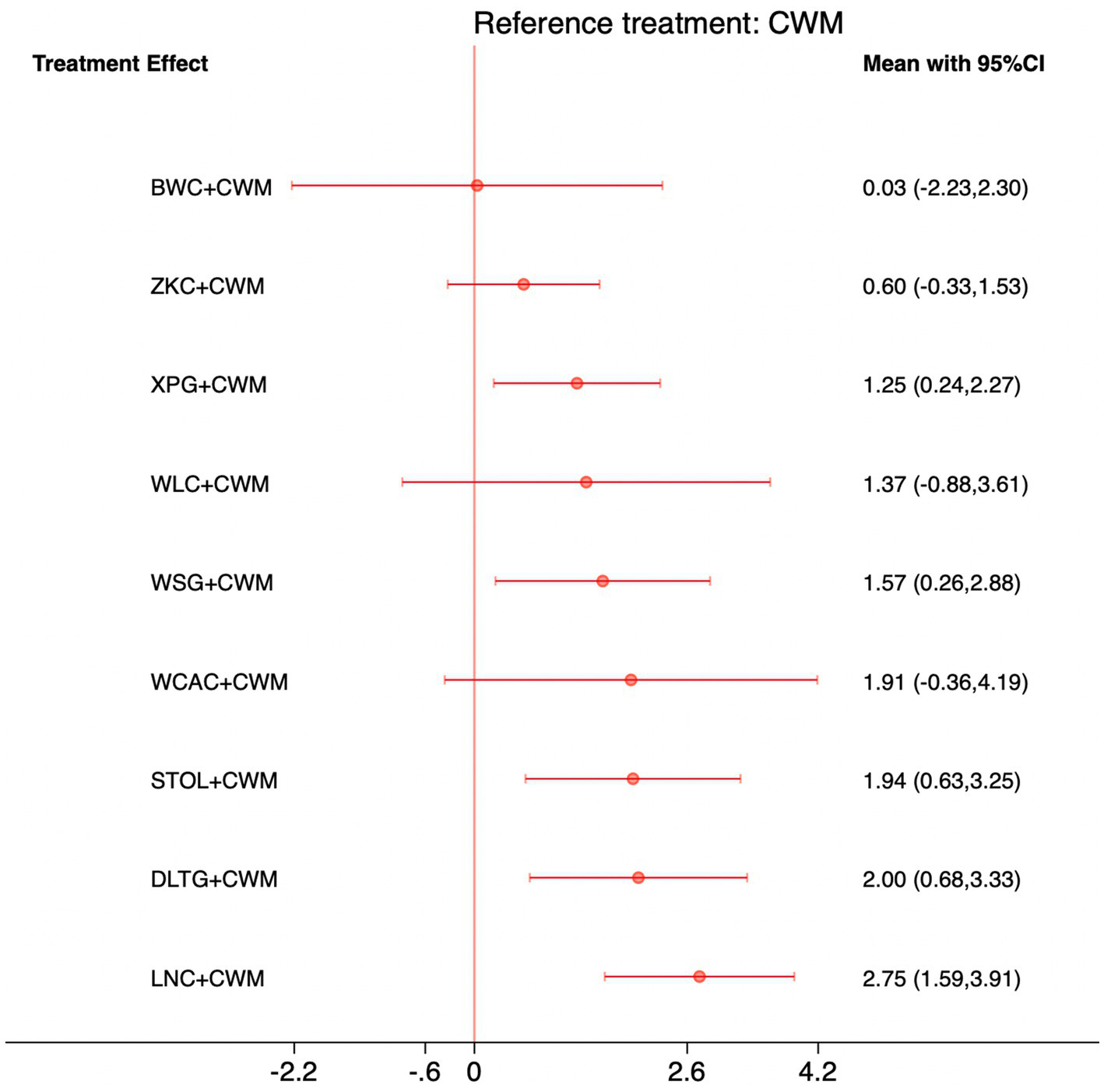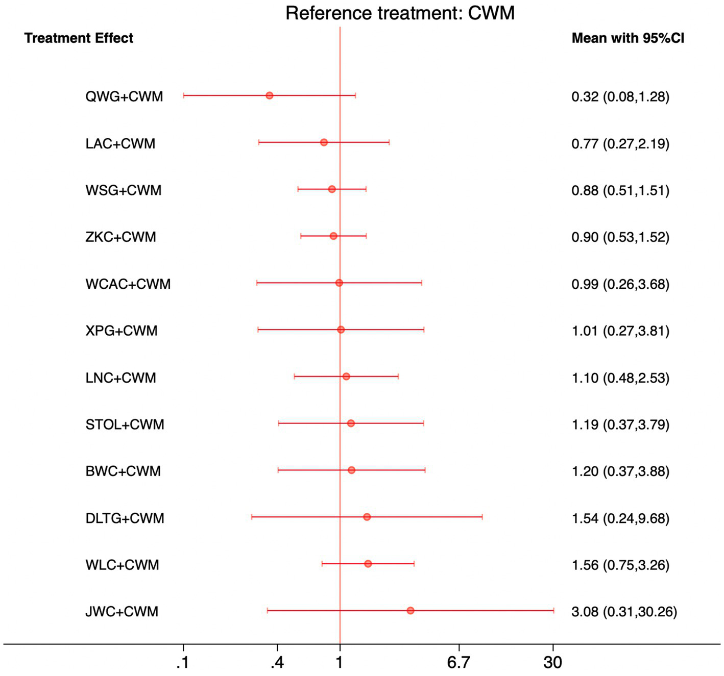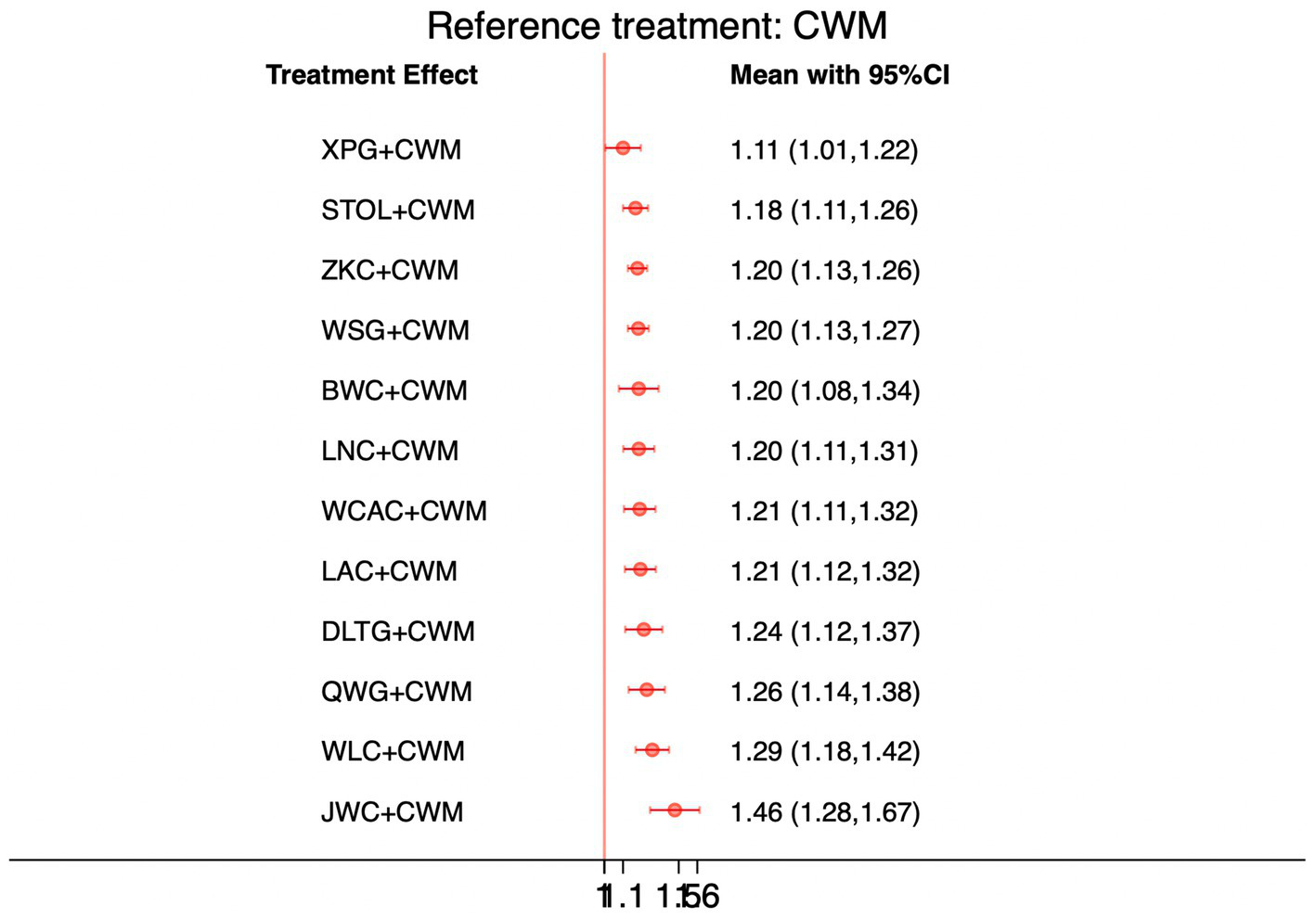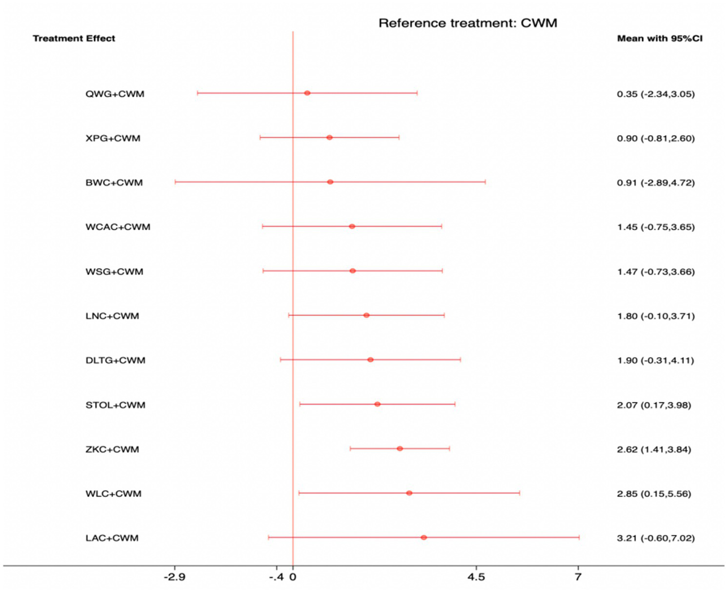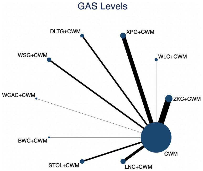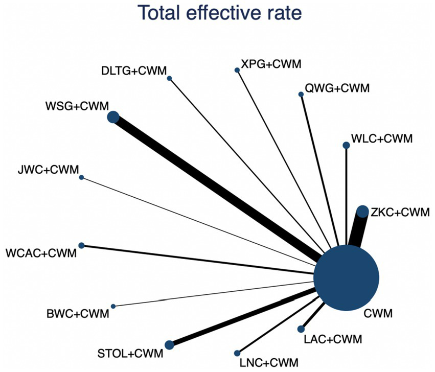 We performed network meta-analyses of RCTs using Stata version 17.0 within a frequentist framework. Relative risks (RRs) with 95% confidence intervals (CIs) were used to compare dichotomous outcomes, including the total effective rate. Odds ratios (ORs) with 95% CIs were applied for adverse event rates, given their suitability in analyzing rare events. Mean differences (MDs) with 95% CIs were used for continuous outcomes, such as MTL and GAS levels. Random-effects models were applied using the restricted maximum likelihood (REML) method to account for between-study heterogeneity.