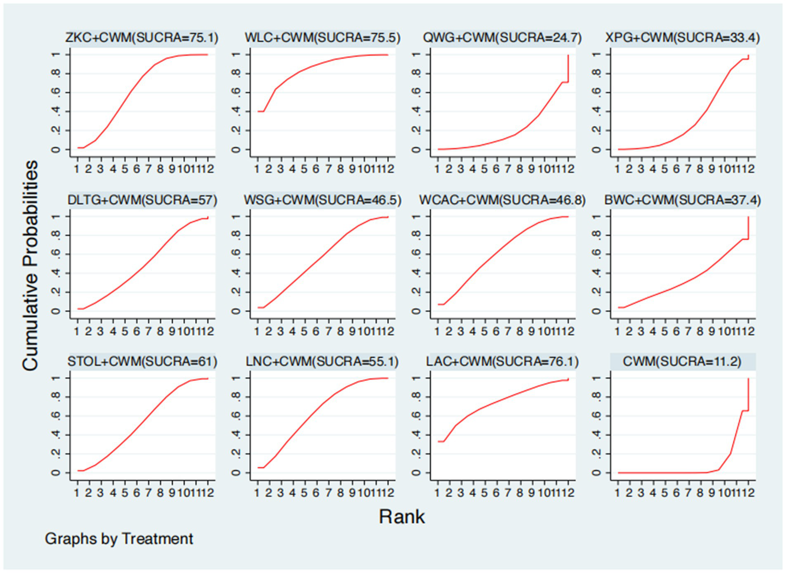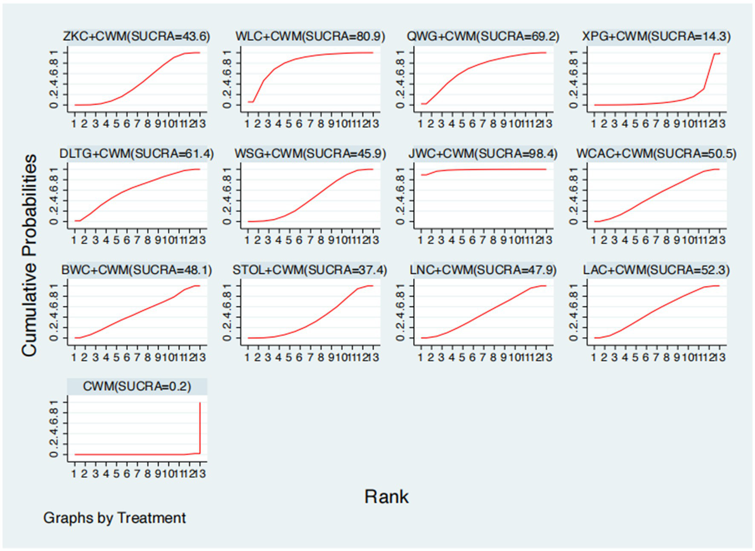 Heterogeneity was assessed with τ2, with thresholds defined as low (<0.04), low—moderate (0.04–0.16), moderate—high (0.16–0.36), and high (>0.36), according to published recommendations. The τ2 value was assumed constant across all comparisons, and a correlation of 0.5 was assumed in the between-study covariance matrix. We used the node-splitting method to examine local consistency between direct and indirect comparisons in closed loops of evidence, and a design-by-treatment interaction model to evaluate global inconsistency across the network. Network diagrams were generated in Stata, in which each node represented an intervention and connecting lines denoted direct comparisons, with the size of nodes and thickness of edges weighted by the number of patients and studies. To compare the relative efficacy of interventions, we constructed a league table of pairwise comparisons and calculated the surface under the cumulative ranking curve (SUCRA) to rank treatments. SUCRA values range from 0 (least effective) to 1 (most effective) and were interpreted with caution, taking into account the clinical relevance of observed differences.