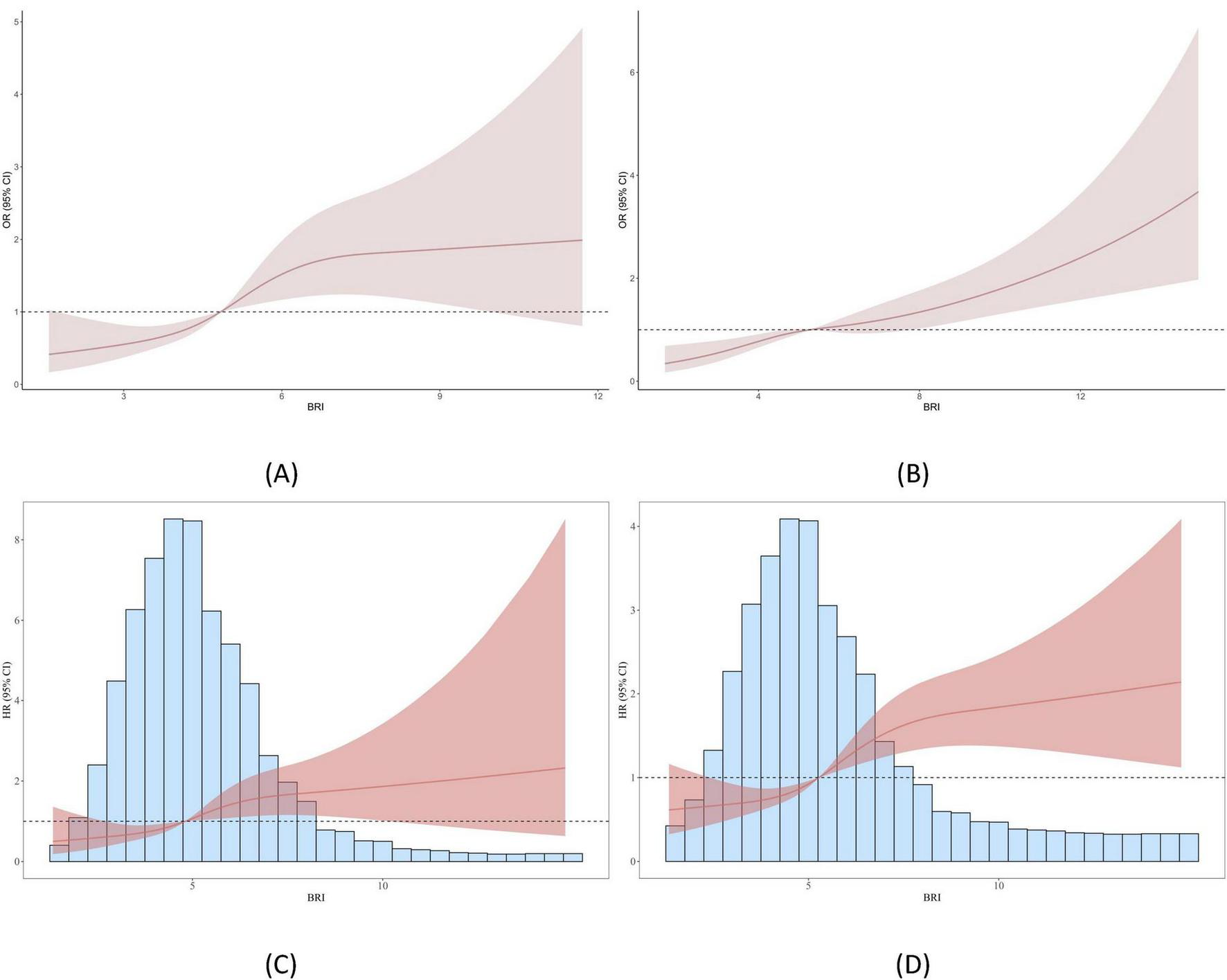To ensure the stability of the models and minimize the risk of multicollinearity, variance inflation factor (VIF) was used for the selection of independent variables. VIF quantifies the level of collinearity between variables, and variables with a VIF greater than 5 were excluded to enhance the model’s stability and interpretability ([22]). Multivariable logistic regression analysis was performed to compute the odds ratio (OR) and its 95% confidence interval (CI) to evaluate the association between BRI and COPD. Cox regression models further explored the hazard ratio (HR) between BRI and incident COPD. Additionally, restricted cubic spline (RCS) analysis was applied to capture potential nonlinear relationships between BRI and COPD. Sensitivity analyses were conducted in two stages: first, by excluding outliers with BRI values below the 5th percentile and above the 95th percentile, and second, by performing multiple imputation to handle missing data. These two approaches were used to assess the robustness and consistency of the results. Finally, subgroup analyses were conducted to further explore the relationship between BRI and COPD.