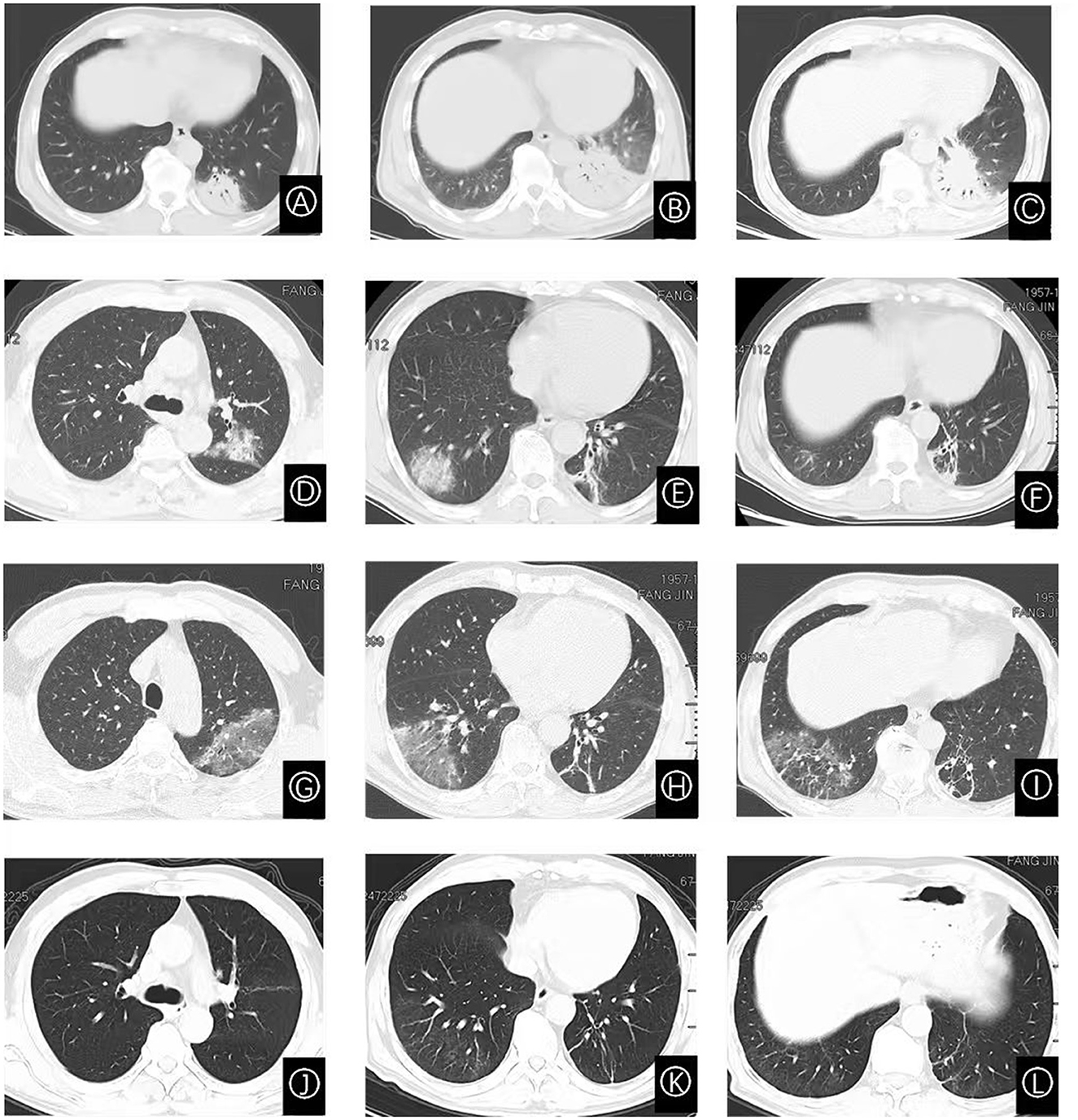 Figure 1. Serial chest CT images demonstrating the dynamic evolution of pulmonary lesions. (A) CT scan obtained on day 5 of illness shows an exudative shadow in the left lower lobe. (B) Scan on day 8 reveals interval enlargement of the lesion in the left lower lobe. (C) By day 14, the exudative shadow shows signs of absorption compared to (B). (D–F) CT images on day 26 demonstrate new, multifocal bilateral pulmonary involvement, featuring exudative shadows, ground-glass opacities, consolidations, and migratory lesions. (G–I) Follow-up on day 37 shows persistent pulmonary lesions with no significant improvement. (J–L) Scan on day 48, following glucocorticoid therapy, shows near-complete resolution of the pulmonary abnormalities.