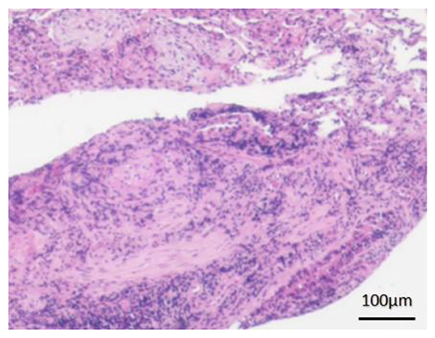 After 11 days of minocycline (100 mg orally every 12 h), repeat CT showed no significant radiographic improvement (Figures 1G–I). Given the clinical picture of recurrent fever with migratory pulmonary lesions, the prior biopsy specimen was re-examined and pathologically diagnosed as OP (Figure 2). Methylprednisolone 40 mg daily was initiated. Doxycycline was continued throughout this period due to the concomitant C. psittaci infection. After 10 days of combined therapy (illness day 48), chest CT showed near-complete resolution of bilateral pulmonary infiltrates (Figures 1J–L). Corticosteroid tapering was initiated 2 weeks later at a rate of 5 mg per week until discontinuation.