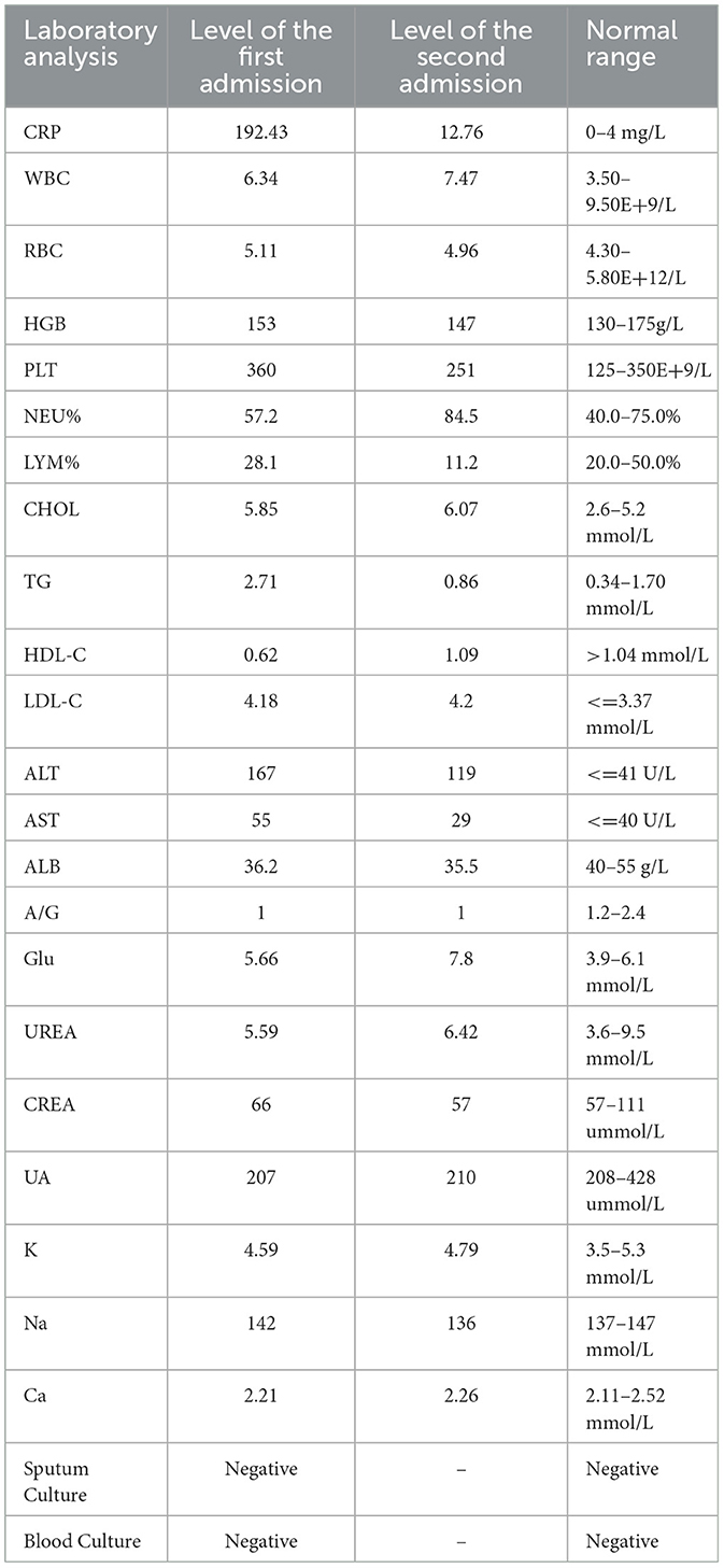 Upon admission, the patient presented with a temperature of 38.5 °C, pulse rate of 102 beats/min, respiratory rate of 18 breaths/min, and blood pressure of 139/61 mm Hg. Auscultation revealed clear breath sounds in both lungs without adventitious sounds. Initial laboratory investigations included routine blood tests and sputum cultures; detailed results are provided in Table 1.