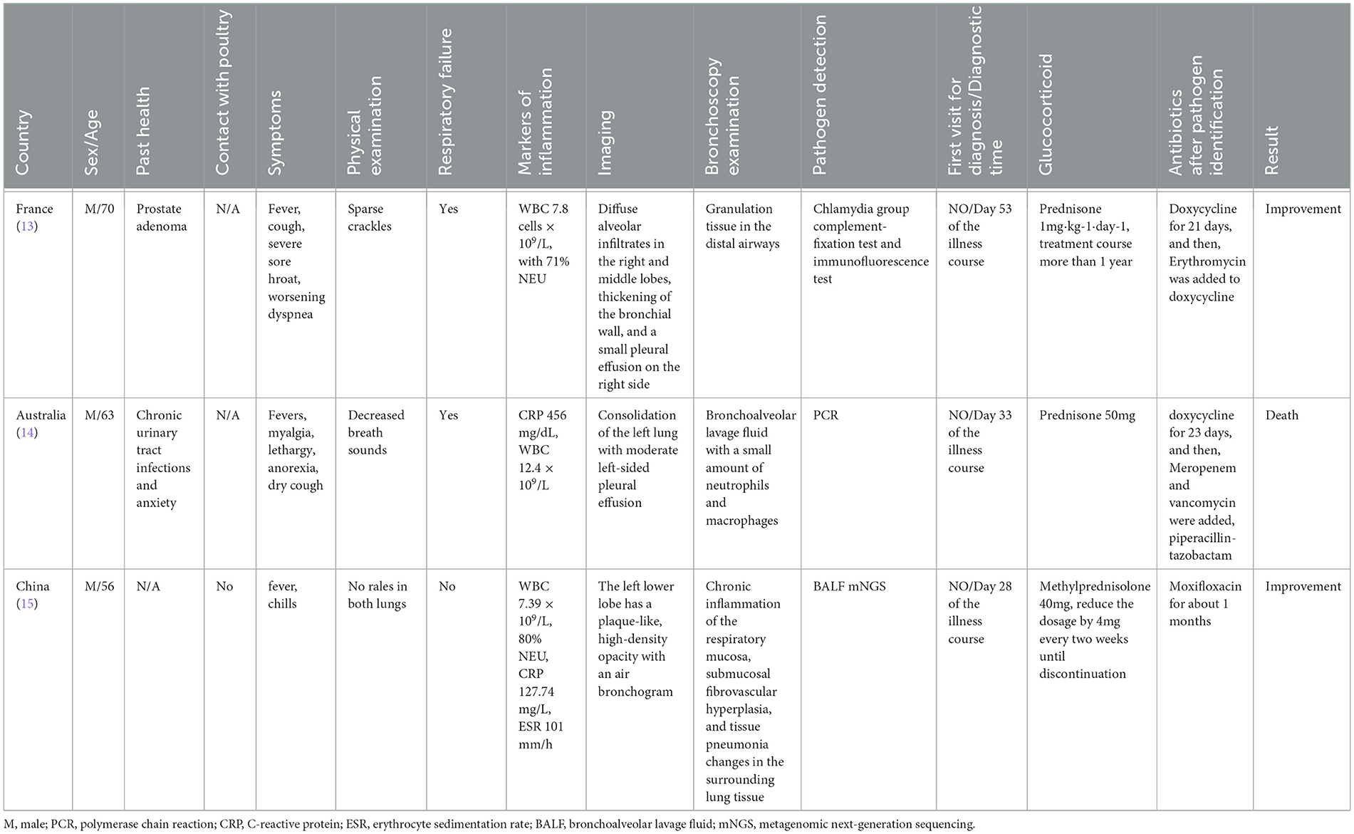 15. Gao Y, Zhang X, Liu J, Gong L, Chen G, Zhou X. Chlamydia psittaci pneumonia complicated with organizing pneumonia: a case report and literature review. IDCases. (2022) 30:e01584. doi: 10.1016/j.idcr.2022.e01584