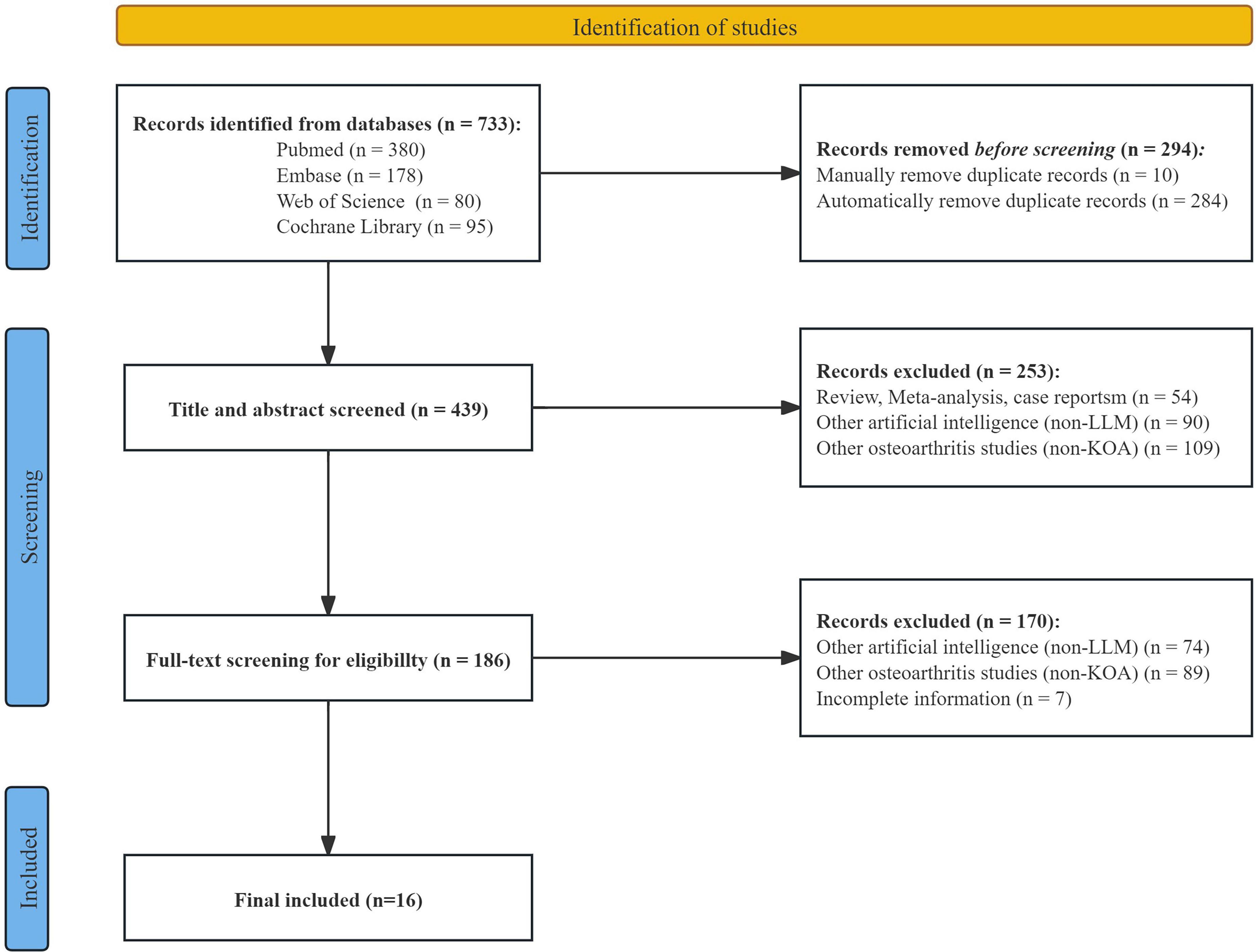 From 2015 to 2025, research involving LLMs in the field of KOA has exhibited a steadily increasing trend. A total of 733 studies were initially retrieved. Following deduplication performed with EndNote (version 21.0), 439 records were retained. Title and abstract screening reduced the pool to 186 studies, and after full-text review, 16 studies were ultimately selected for systematic evaluation (Figure 1). Among the included studies, ChatGPT (e.g., ChatGPT-3.5, ChatGPT-4, ChatGPT-4o) were the most frequently employed LLMs, along with other models such as Gemini and Claude. These LLMs were applied across diverse KOA-related scenarios, including imaging-based diagnosis, clinical decision support, and patient education. Specific tasks included text generation, medical question answering, and generating personalized treatment recommendations. In terms of evaluation metrics, most studies adopted a comprehensive, multidimensional assessment framework, integrating both subjective and objective indicators.