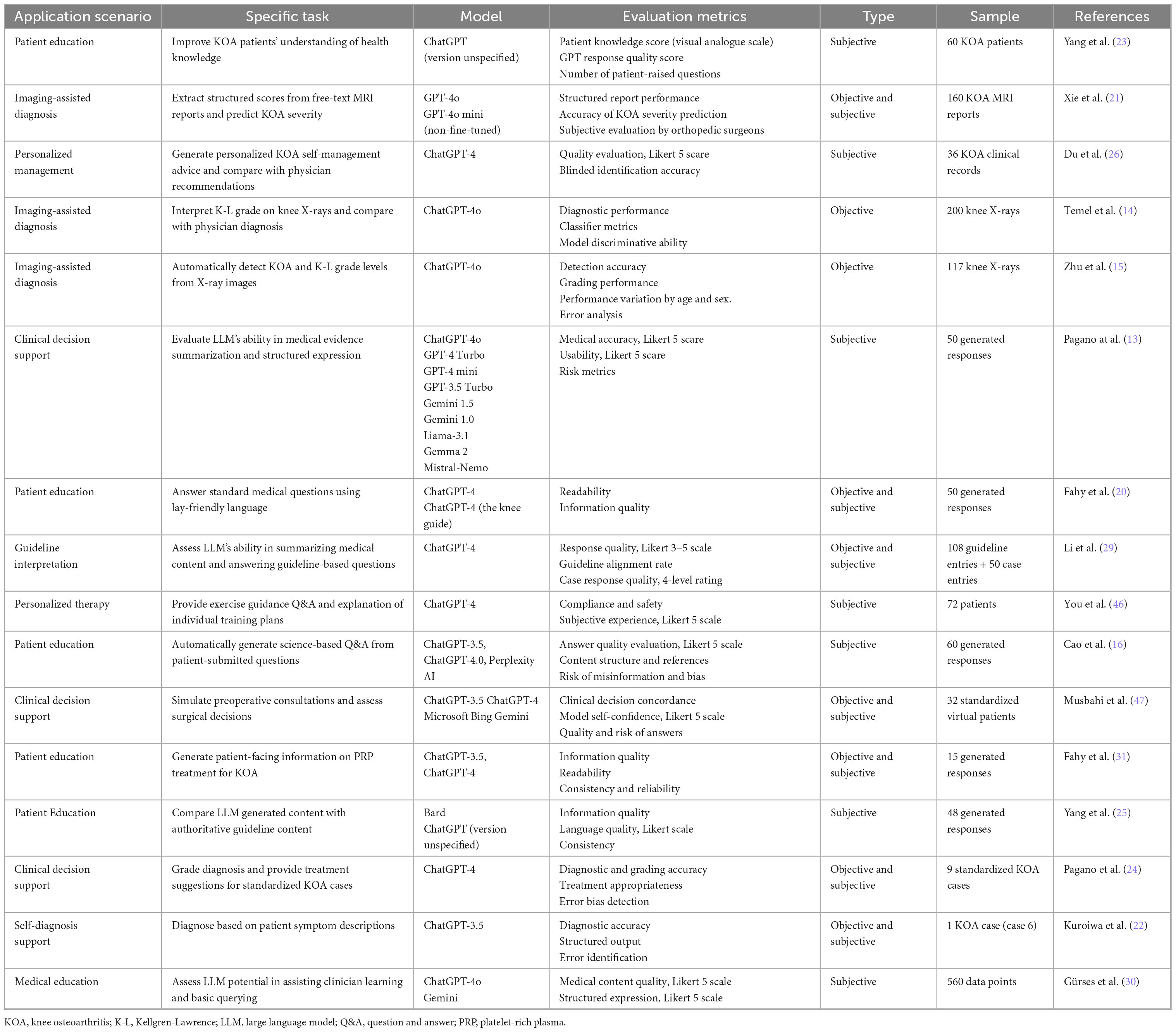 LLMs have been increasingly investigated for clinical applications across various domains in orthopedics, including improving the readability of patient education materials for spinal disorders (10), and supporting medical knowledge popularization related to anterior cruciate ligament injuries (11). However, in the context of KOA, a prevalent chronic degenerative condition, the systematic clinical application of LLMs remains nascent, with limited comprehensive evaluations and few cross-model comparisons. This study presents the first systematic review of LLMs applications in KOA, synthesizing empirical evidence from the past decade. It provides a structured analytical framework and a tiered performance evaluation spanning application scenarios, task categories, model behaviors, and methodological rigor.