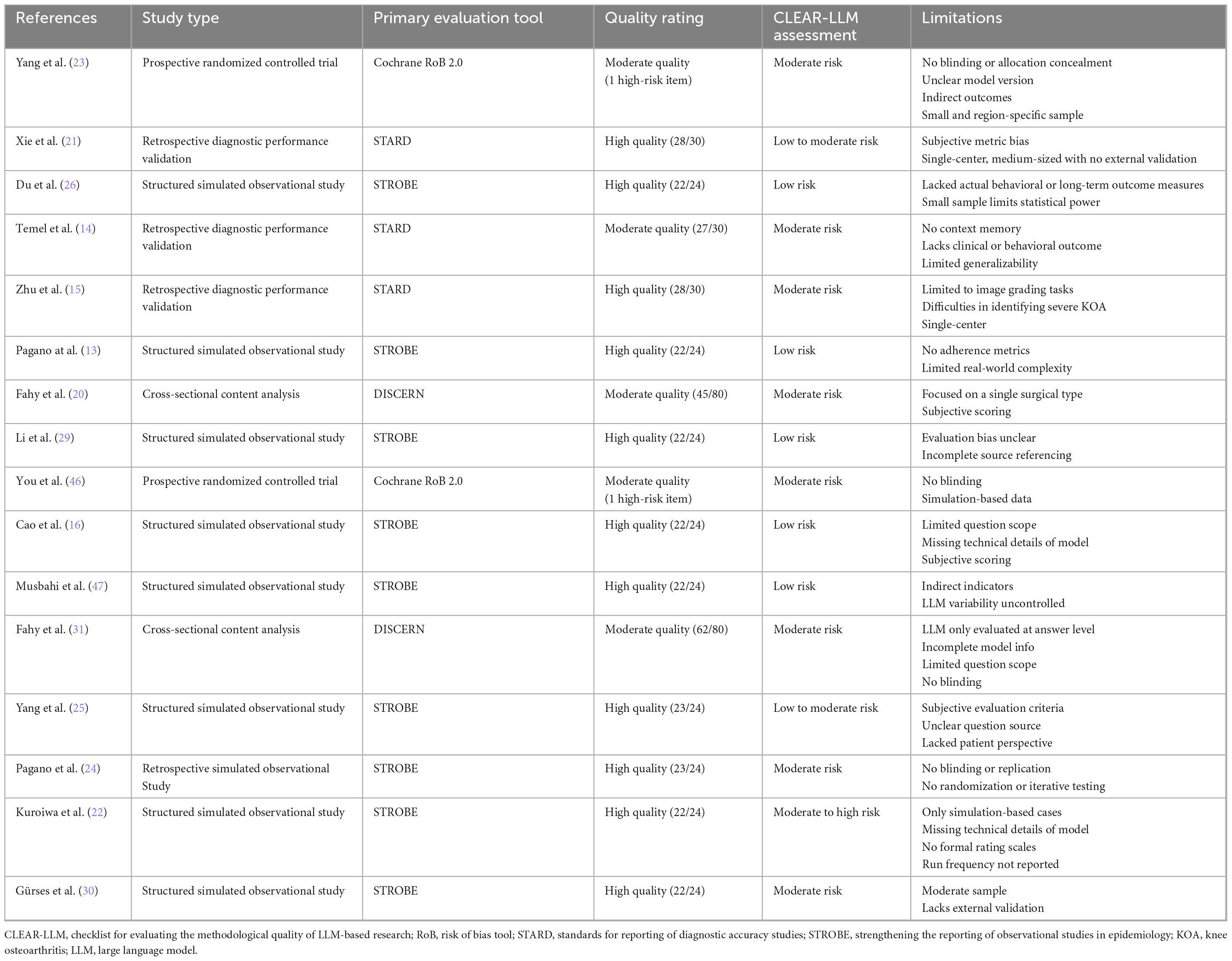 For all included studies, two reviewers (ZM and YL) independently conducted the quality assessment. An initial classification was performed based on the titles and abstracts, followed by the selection of appropriate appraisal tools according to the study design upon full-text review. Specifically, randomized controlled trials (RCTs) were assessed using the Cochrane risk of bias tool (4); diagnostic accuracy studies were assessed using the standards for reporting diagnostic accuracy studies (STARD) checklist (5); observational studies were assessed using the strengthening the reporting of observational studies in epidemiology (STROBE) guidelines (6); and educational or informational resources were assessed using the DISCERN instrument (7). In addition, guided by AI-specific reporting standards such as CONSORT-AI (8), we developed a checklist for evaluating the methodological quality of LLM-based research (CLEAR-LLM), specifically designed to address the unique characteristics of LLMs research. This secondary evaluation tool encompasses 12 dimensions, including model description, prompt design, human evaluation, output quantification, among others (Supplementary Data).
