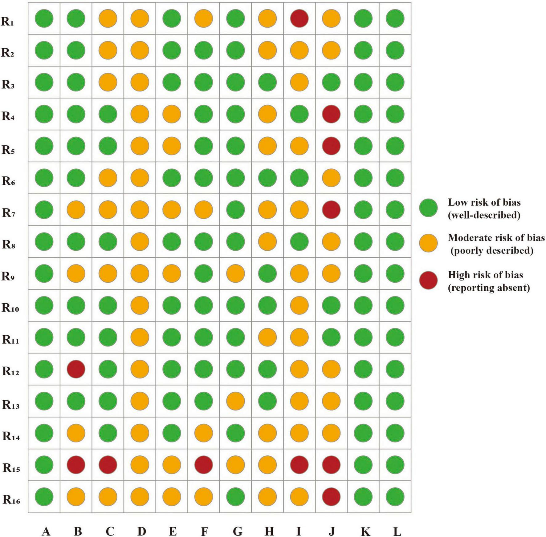 Figure 2. Risk assessment of CLEAR-LLM. R1–16, research 1–16; A, clarity of research objectives; B, control design; C, data sources and transparency; D, model description; E, prompt design; F, role of human evaluators; G, output evaluation and quantification; H, patient-relevance indicators; I, sample size and representativeness; J, bias control; K, ethical considerations; L, discussion of limitations.