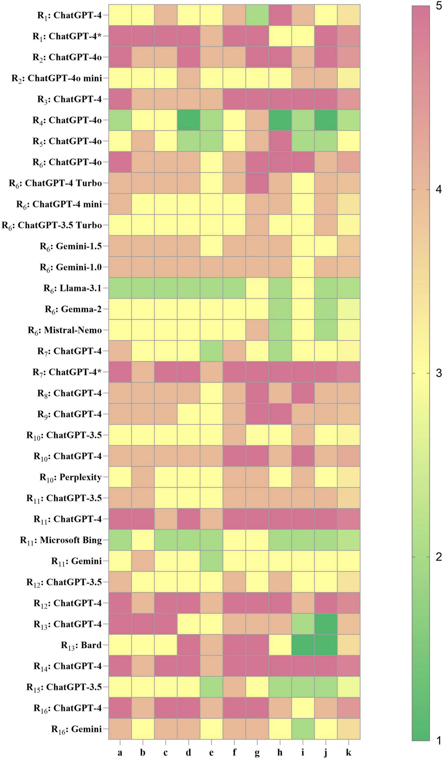Figure 3. Performance heatmap of LLMs in KOA in current research. Higher values indicate better performance. R1–16, research 1–16; a, accuracy of medical content; b, contextual coherence; c, interpretability of medical terminology; d, clinical usefulness; e, hallucination control; f, safety and ethical compliance; g, structured output; h–j, flexible dimensions (detailed in Supplementary Materials); k, overall composite score. ChatGPT-4* , LLM fine-tuned based on KOA knowledge.