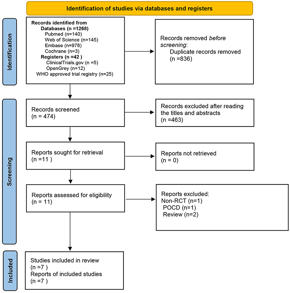 The database search yielded 1,310 records that were deemed potentially eligible for inclusion. After eliminating duplicates, we reviewed 474 records by examining their titles and abstracts. Out of these, 463 records were discarded due to being unrelated to the topic, while 11 records satisfied the inclusion criteria. A further 4 publications were excluded for the following reasons: one was identified as a non-randomized controlled study, two were categorized as review articles, and one was classified as pertaining to postoperative cognitive dysfunction (POCD). Eventually, seven studies were included in the meta-analysis (16–22) (Figure 1).