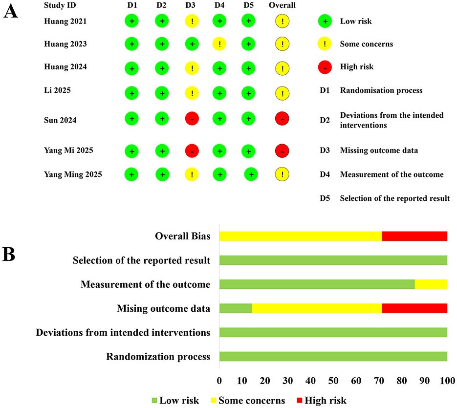 Figure 2. Summary of the risk of bias assessment. (A, B) showing risk assessment across various studies. (A) lists seven studies with domains D1 to D5, using green for low risk, yellow for some concerns, and red for high risk. (B) displays aggregated risk percentages for each domain, with varying lengths of colored bars depicting the level of risk.