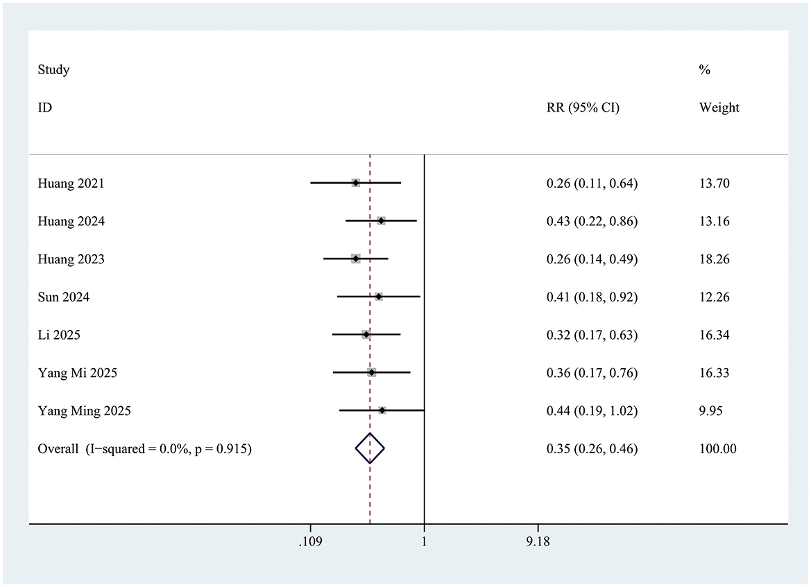 The sensitivity analyses revealed that no single study unduly influenced the overall risk ratio (RR) and its 95% confidence intervals (Supplementary Figure 9). Furthermore, analyses stratified by postoperative care, research teams, anesthesia techniques, and diabetic status demonstrated consistent intervention effects with no significant differences across subgroups, confirming the robustness of the findings (Supplementary Table 2). Funnel plot was unsuitable for assessment of publication bias because the number of included studies was seven.