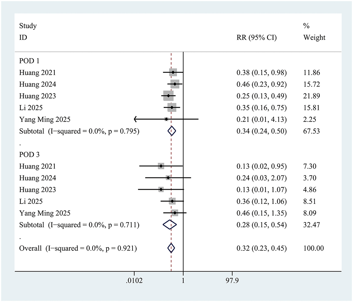The incidence of postoperative delirium (POD) within the first 3 days was significantly lower in the INI group compared to controls (RR = 0.35; 95% CI 0.26–0.46; P < 0.001; I = 0%) (Figure 3). This significant reduction persisted at postoperative day 1 (RR = 0.34; 95% CI 0.24–0.50; P < 0.001; I2 = 0%) and day 3 (RR = 0.28; 95% CI 0.15–0.54; P < 0.001; I2 = 0%) (Figure 4).